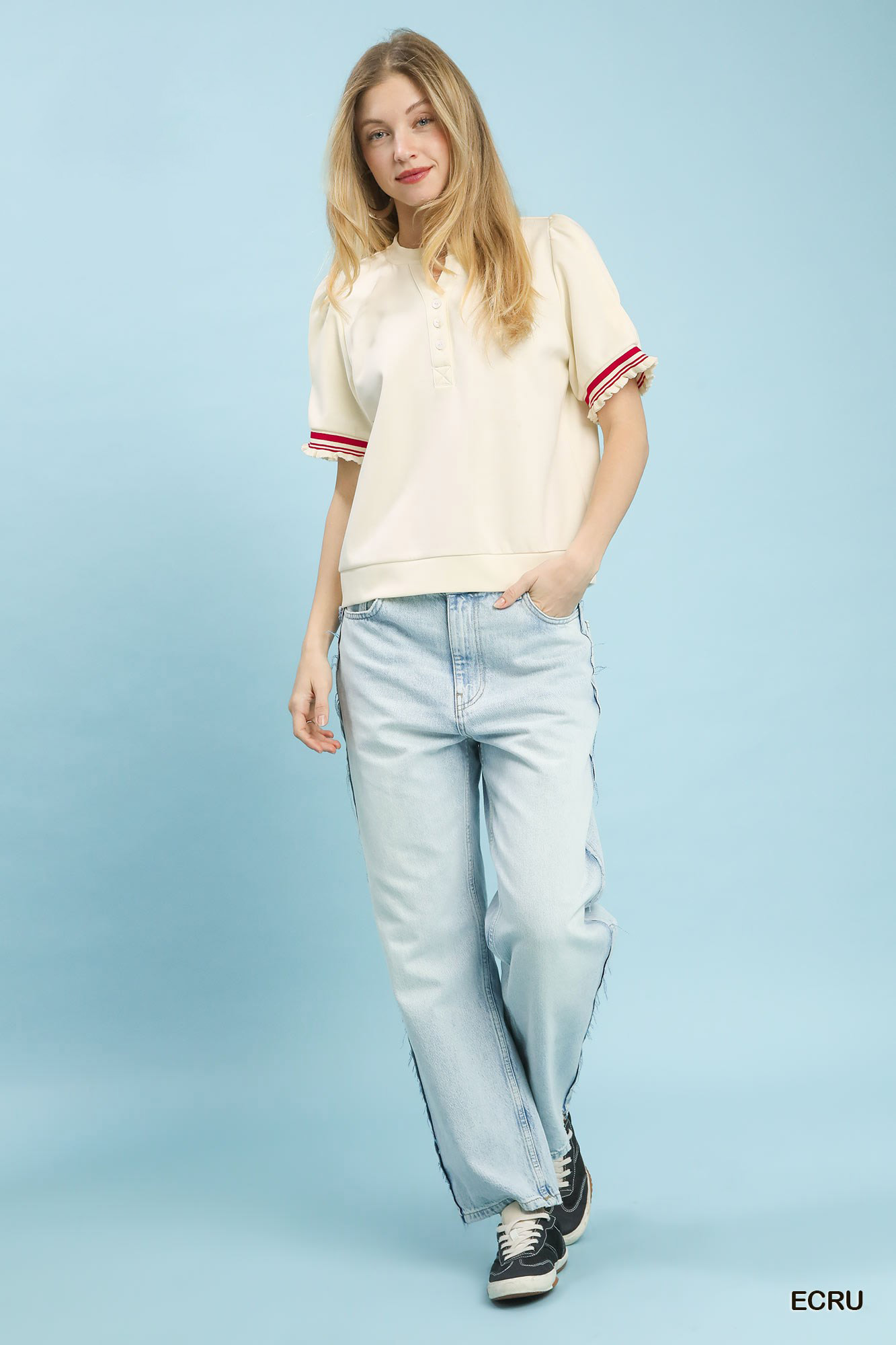 This Puff Sleeve Knit Top with Contrast Trim features a split V-neck with button detail for a stylish touch. The short puff sleeves with contrast stripe trim add a trendy and feminine flair to the design. It is finished with a rib band for a comfortable fit. This top is not lined, making it lightweight and perfect for layering or wearing on its own. Elevate your look with this chic and fashionable puff sleeve knit top!
