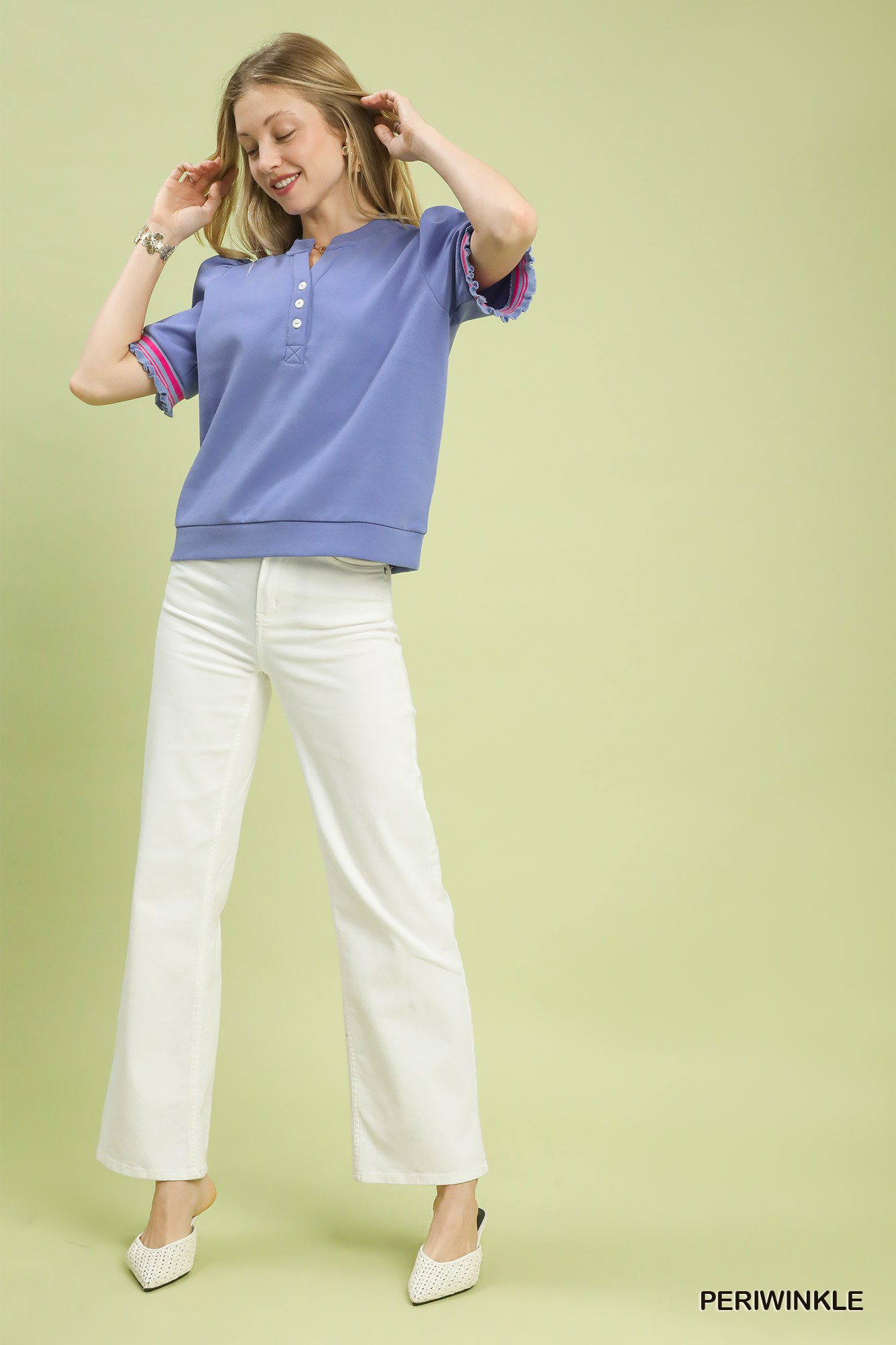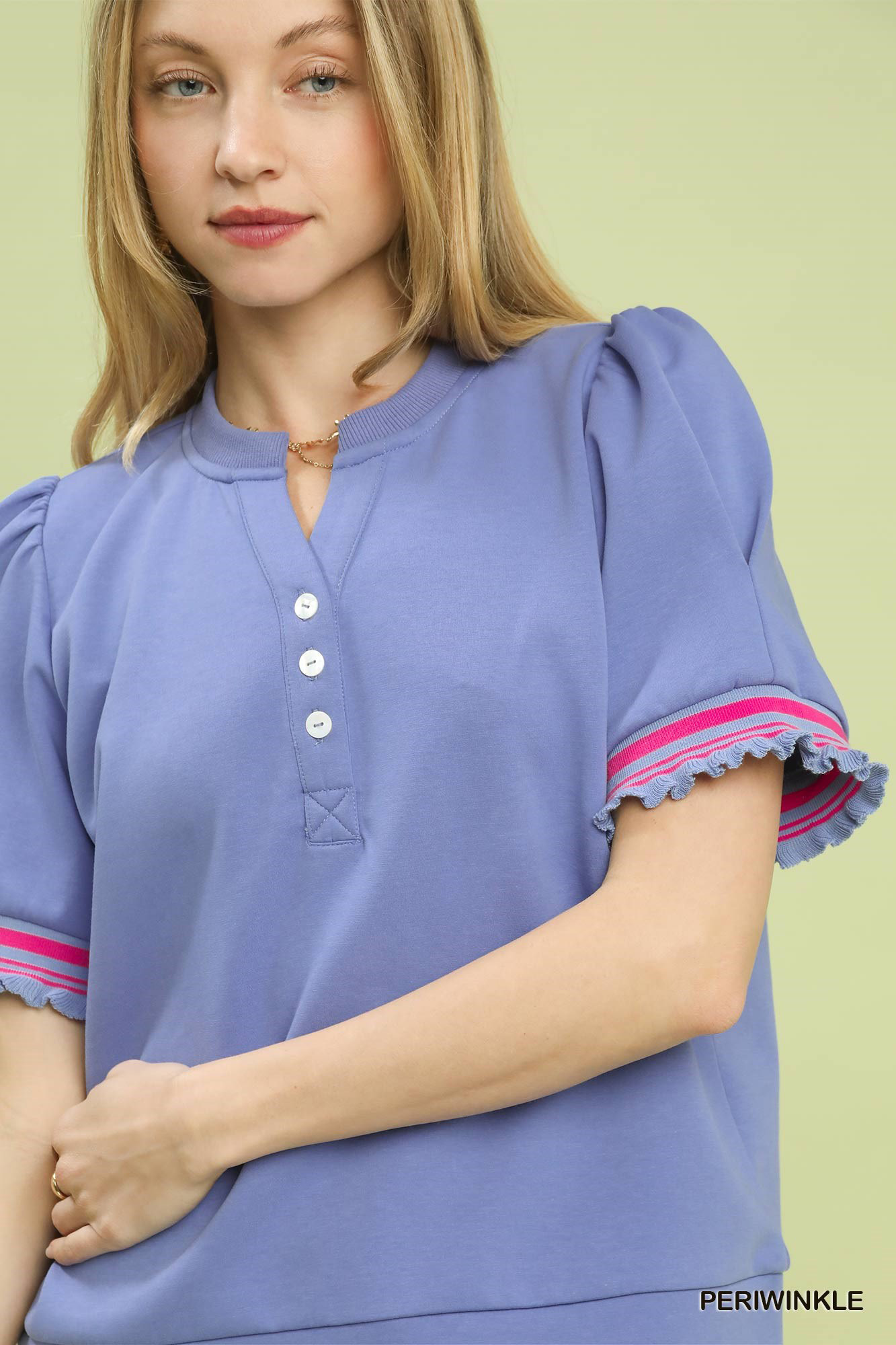 This Puff Sleeve Knit Top with Contrast Trim features a split V-neck with button detail for a stylish touch. The short puff sleeves with contrast stripe trim add a trendy and feminine flair to the design. It is finished with a rib band for a comfortable fit. This top is not lined, making it lightweight and perfect for layering or wearing on its own. Elevate your look with this chic and fashionable puff sleeve knit top!
