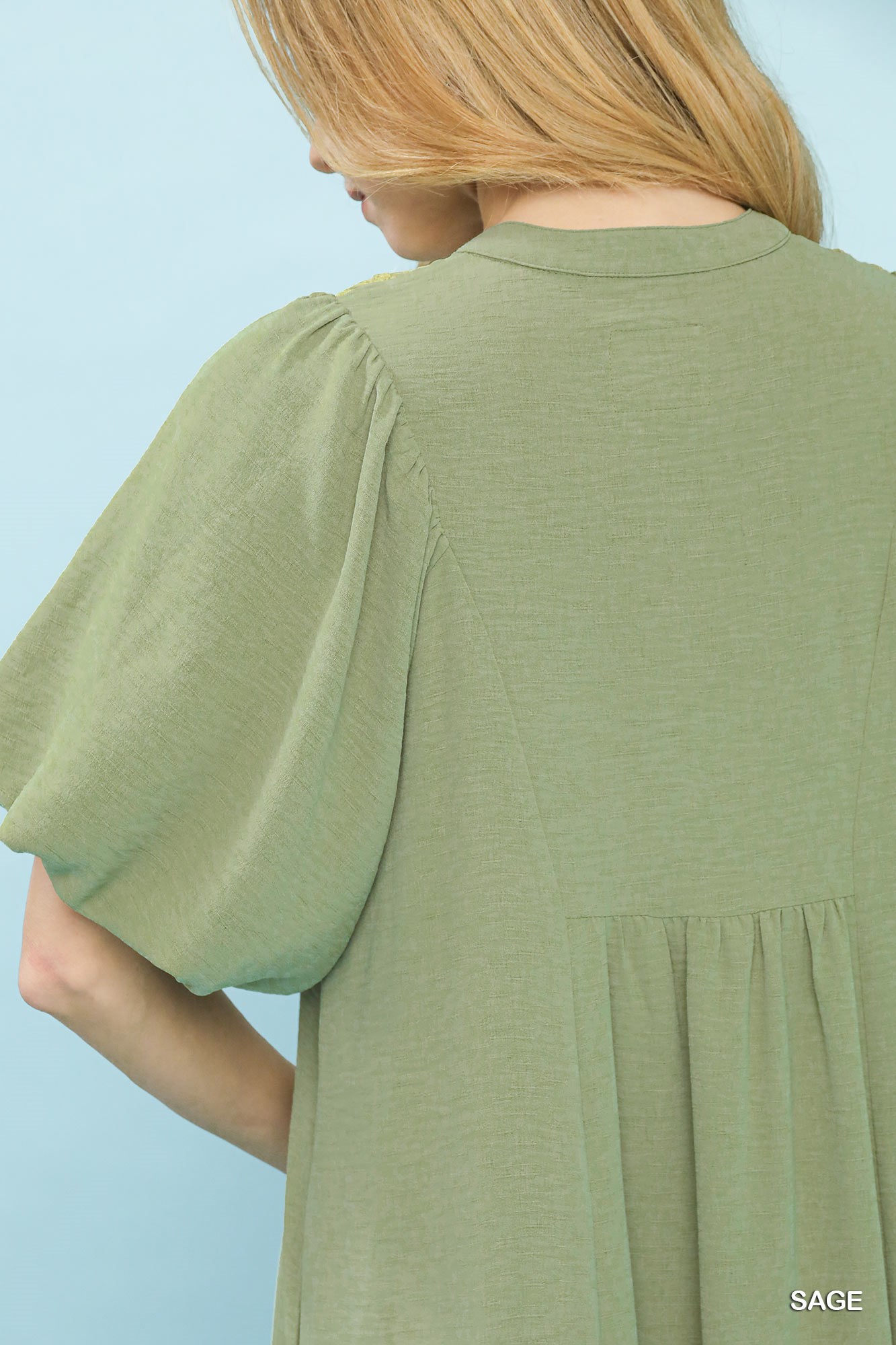 A puff sleeve midi dress with lace detail combines trendy puff sleeves with delicate lace accents for a feminine and romantic look. The puff sleeves add volume and drama to the dress, while the lace detailing brings a touch of elegance and sophistication. The midi length falls below the knee, making it a versatile option for various events. This dress is perfect for adding a stylish and chic flair to your wardrobe, whether for a special occasion or a casual outing. Overall, the combination of puff sleeves and lace detailing on a midi dress creates a beautiful and fashion-forward ensemble.