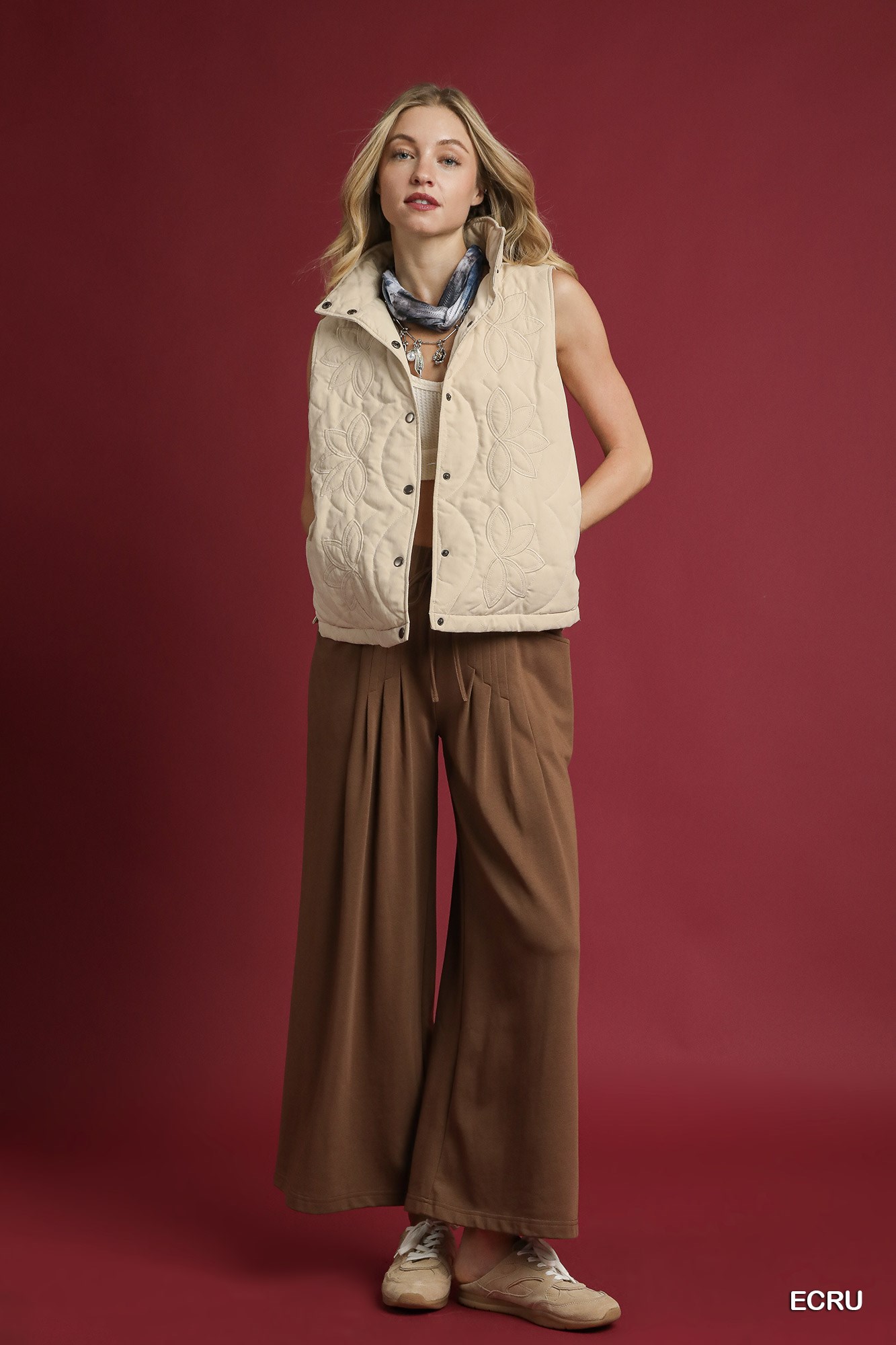 Stay warm and stylish with this Quilted Embroidered Vest, featuring a variety of key features. The front snap button closure offers both convenience and a modern touch to the design. The high stand collar provides extra warmth and a sophisticated look. Side slits and pockets add practicality and style to this versatile vest. The sleeveless design allows for easy layering over long sleeves or sweaters. With a lined interior for added comfort, this quilted embroidered vest is perfect for completing your fall and winter outfits.