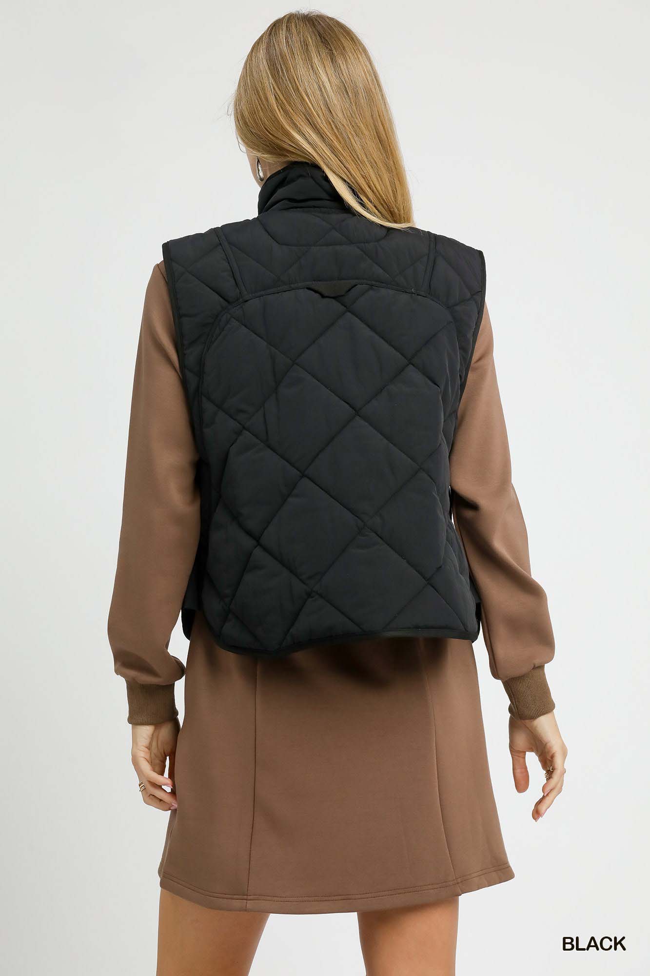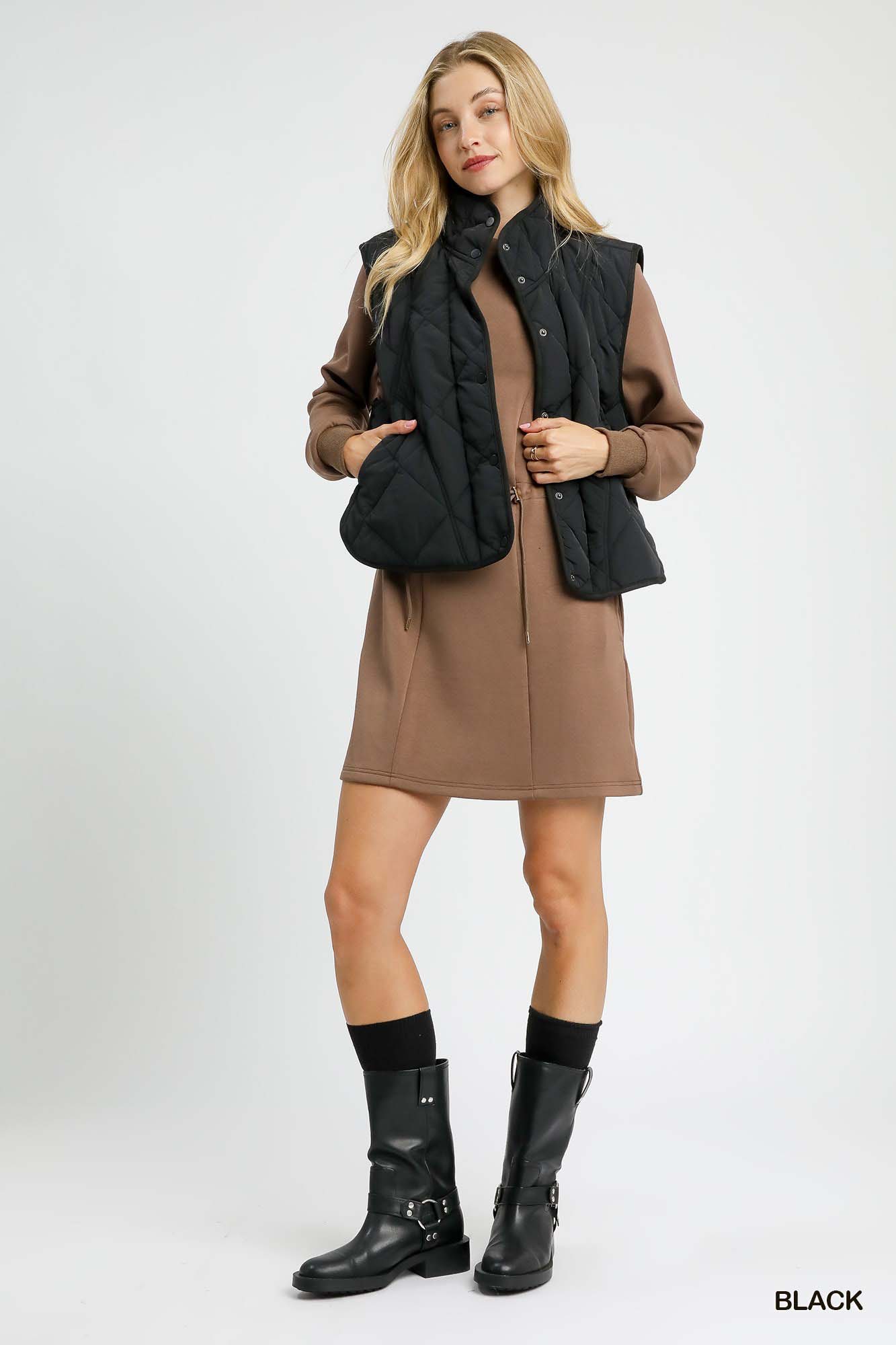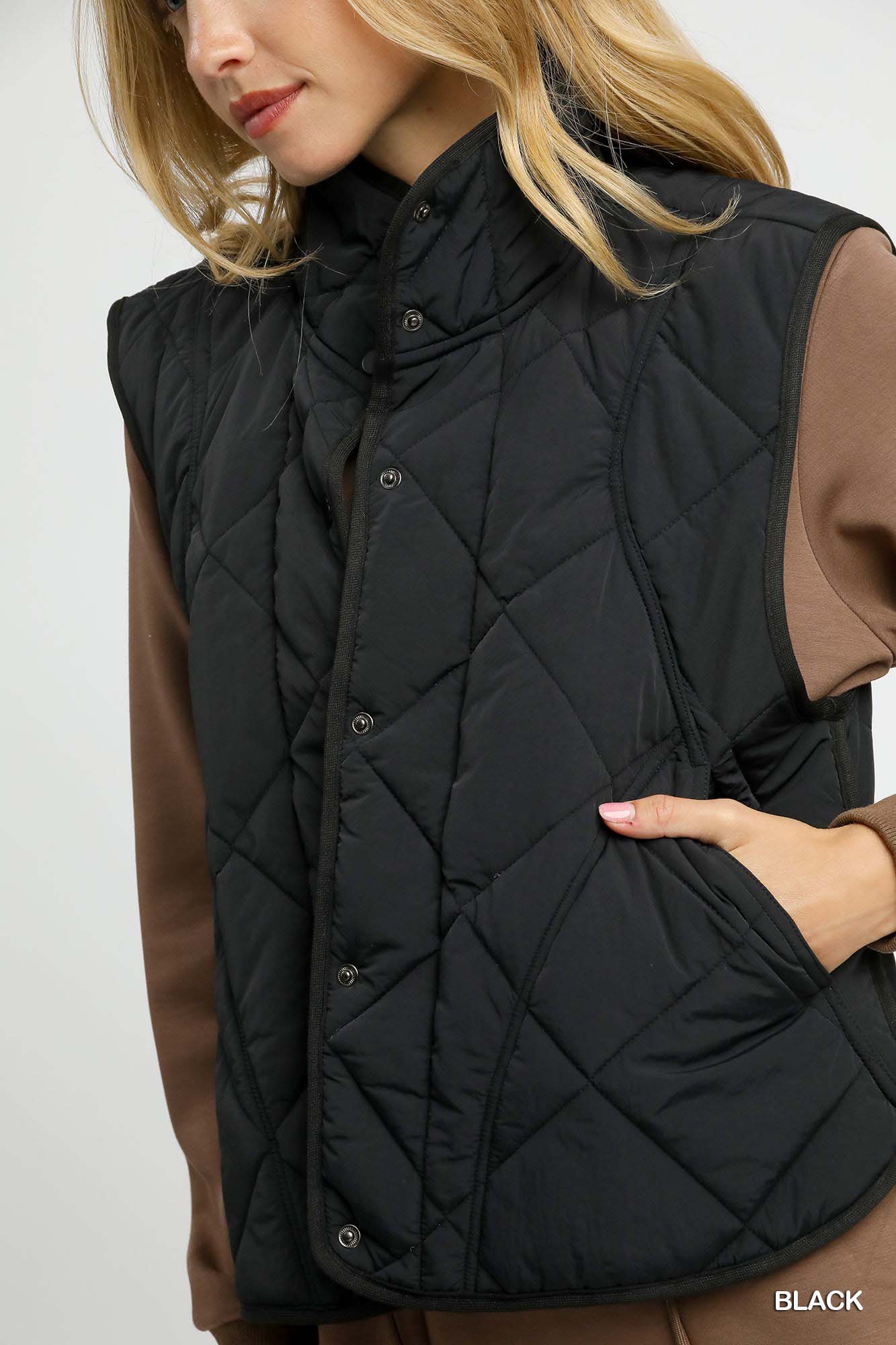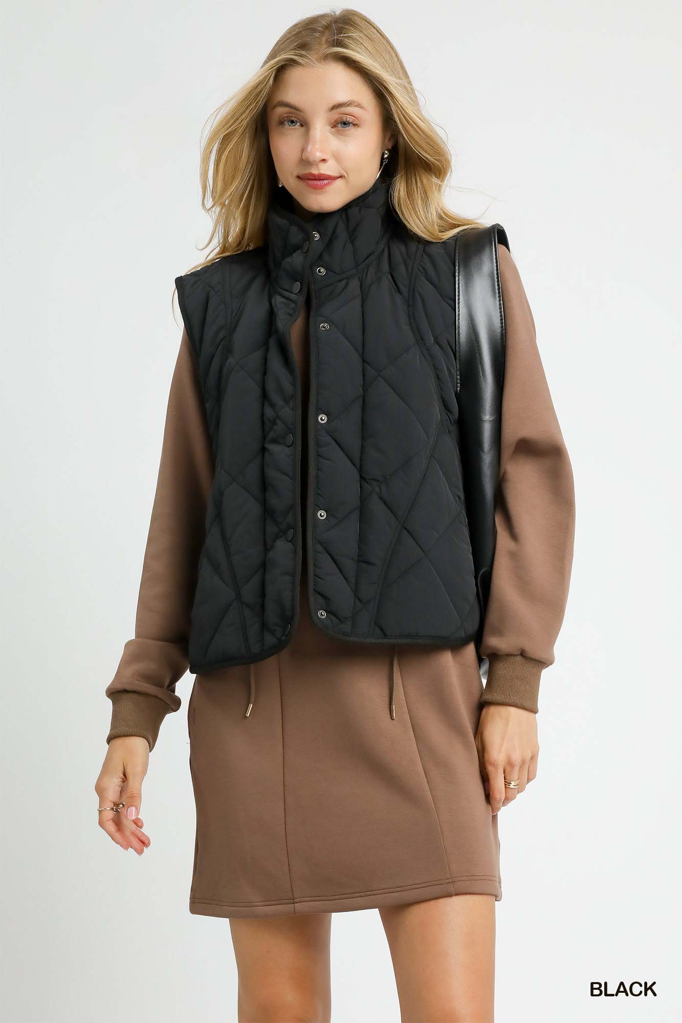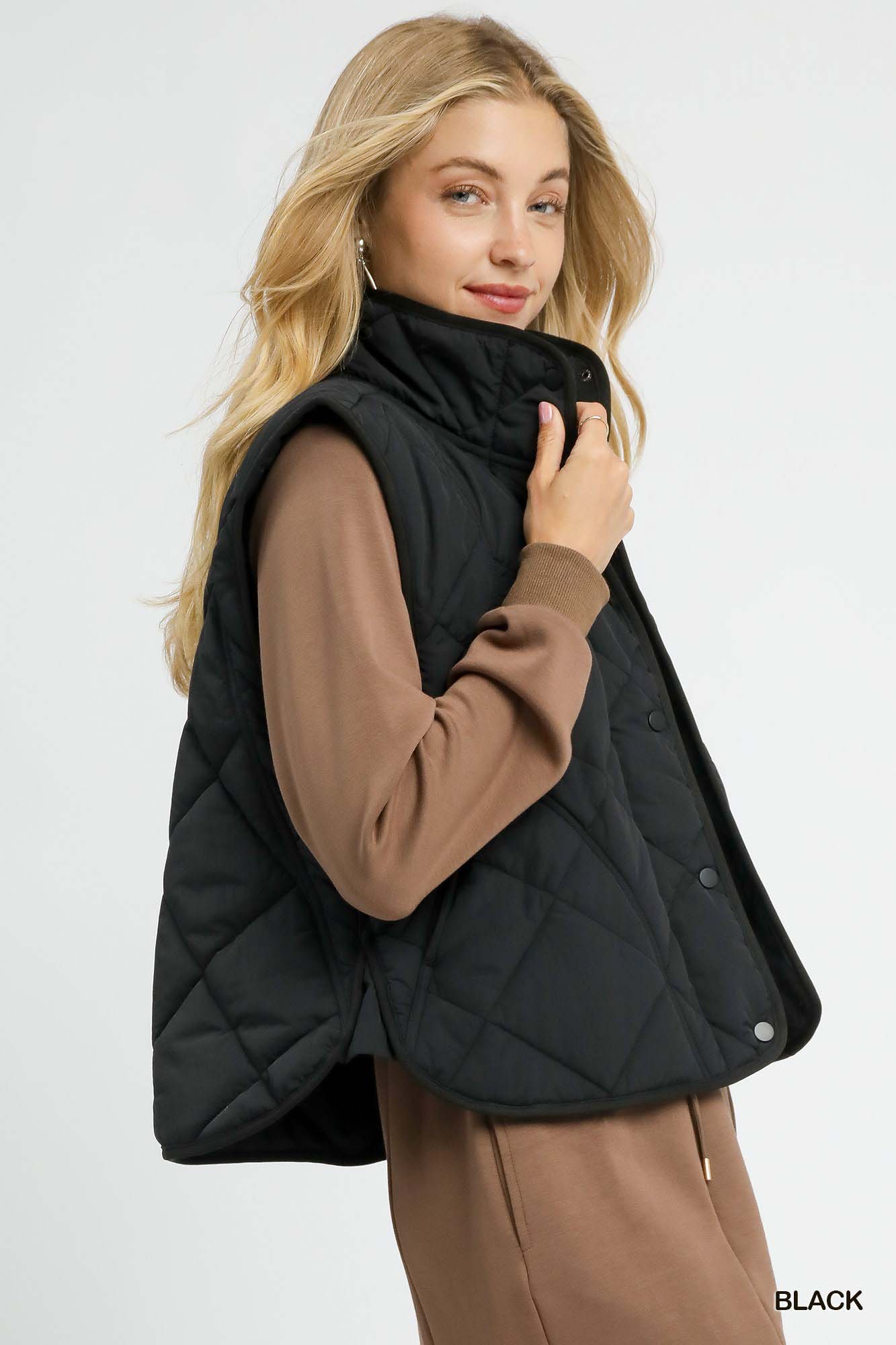 Elevate your winter wardrobe with the Quilted Snap-Front Puffer Vest featuring an oversized fit for a cozy and trendy look. The snap-button front closure and stand-up mock neck provide added warmth and comfort while allowing for easy layering. Convenient side pockets offer functionality and style, perfect for storing essentials or keeping your hands warm. Lined for extra warmth and insulation, this vest is a versatile and practical piece for cool weather. Whether you're running errands or enjoying outdoor activities, this puffer vest combines fashion and function to keep you comfortable and on-trend.
