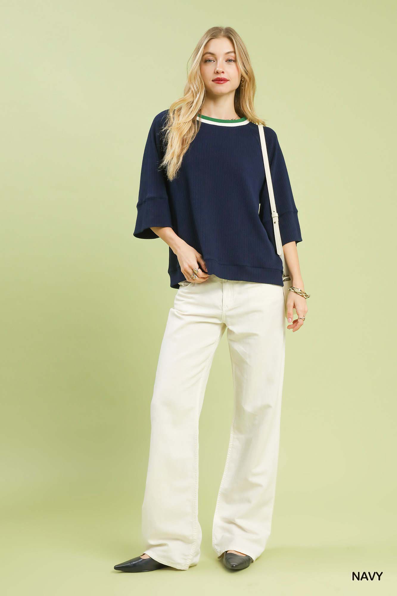 Elevate your everyday style with this Ribbed Knit Top. The soft ribbed knit blend offers both comfort and style. It features a classic crew neckline with a contrast trim detail for a stylish touch. The half-length wide sleeves give a modern and laid-back look. This top is not lined, making it perfect for layering or wearing on its own.