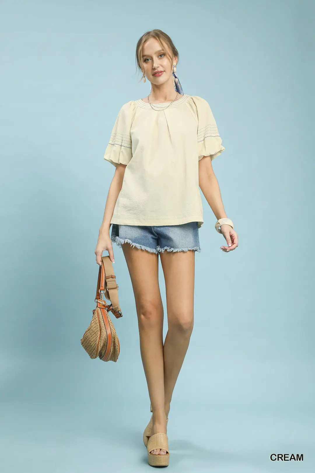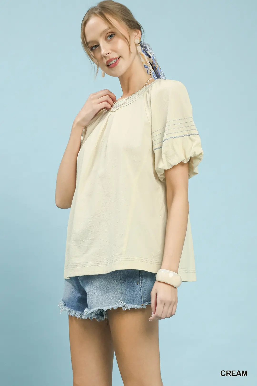 Umgee Round Neck Puff Sleeve Top with Contrast Stitch Detail