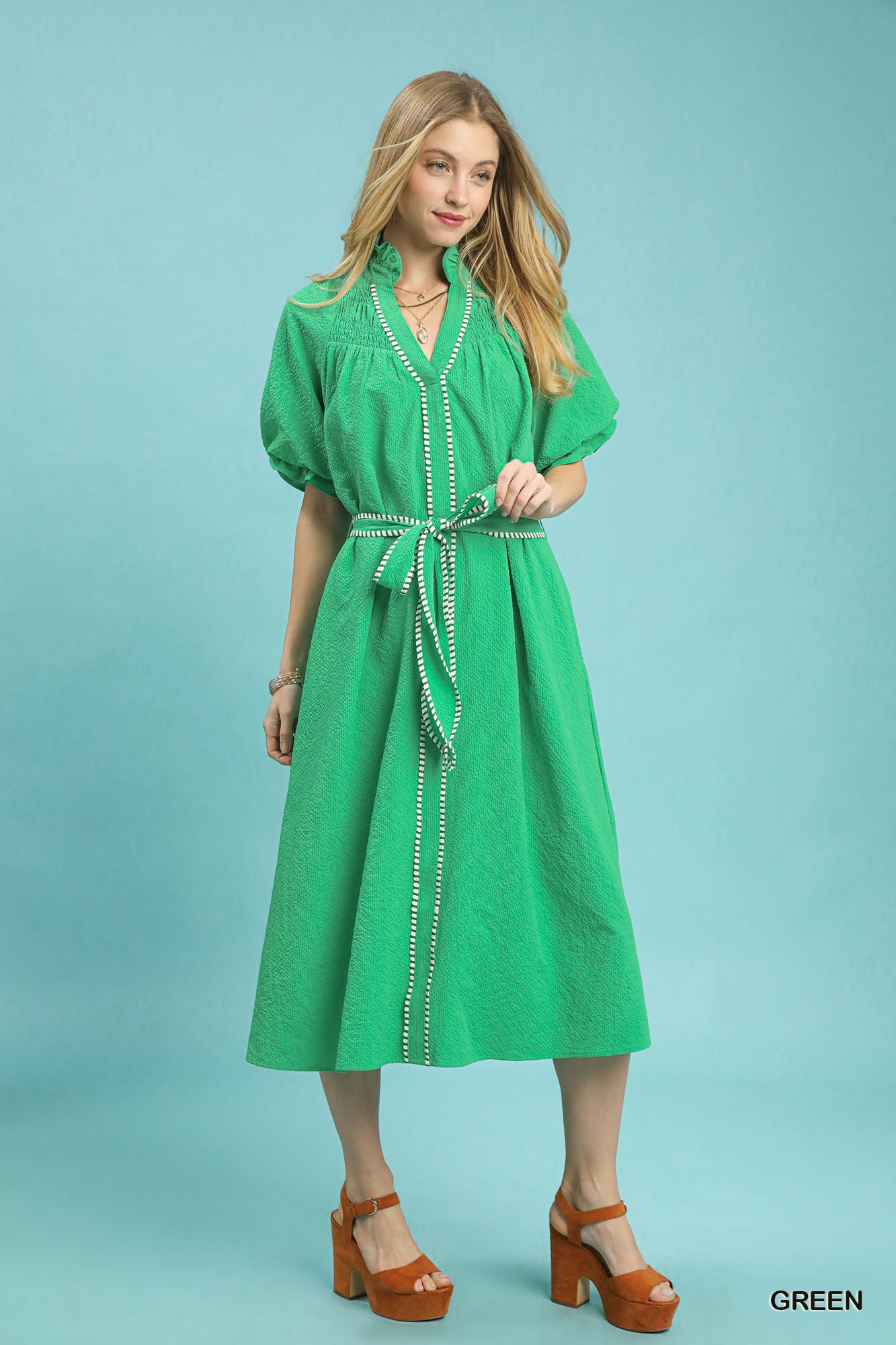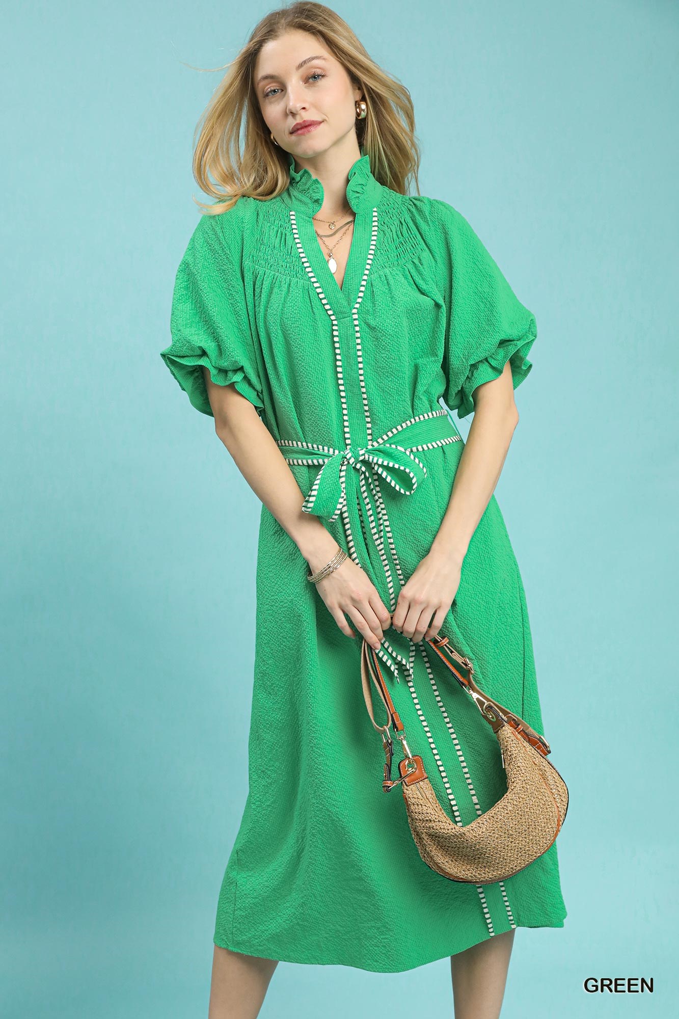 The ruffle collar midi dress with stripe trim features an array of key details. It includes a contrast striped trim that adds a unique touch to the design, smocked detailing for texture and flexibility, and a split V-neck for a stylish and flattering neckline. The puff sleeves offer a touch of drama and sophistication, while the self-tie belt cinches the waist for a defined silhouette. Additionally, the dress is lined for comfort and a polished finish. Overall, this dress combines stylish elements to create a chic and feminine look perfect for various occasions.