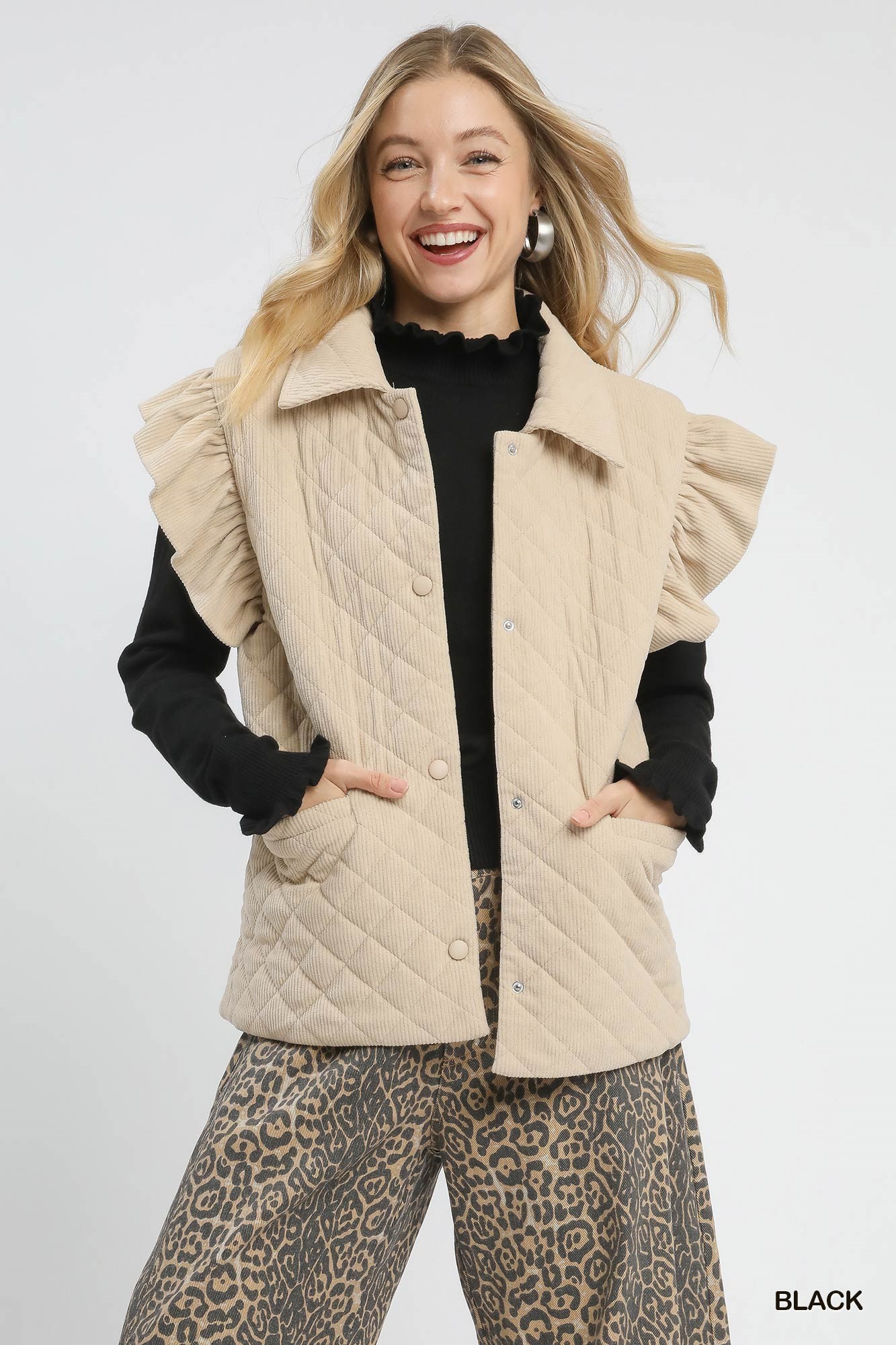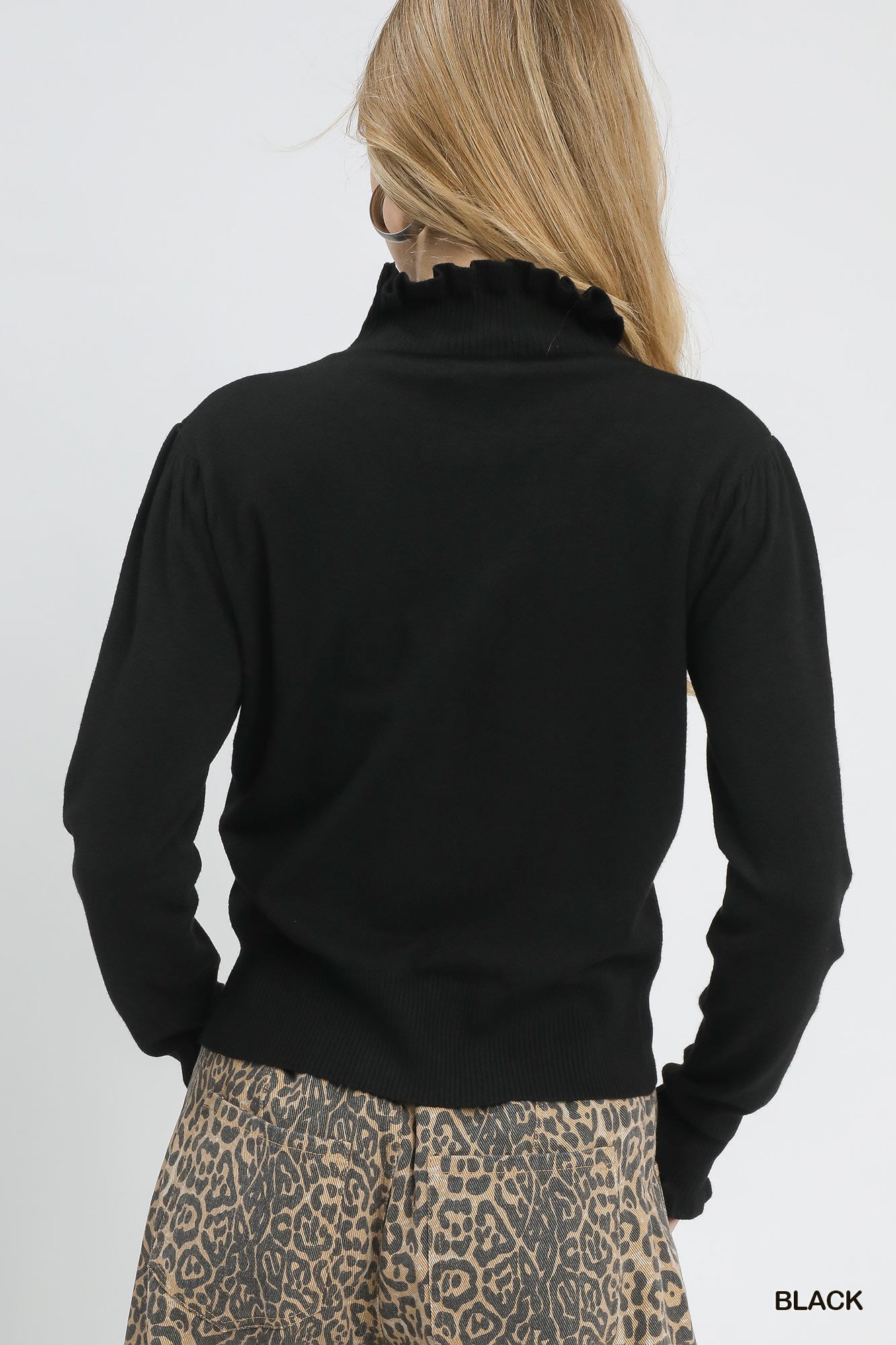 The Ruffle Mock Neck Sweater is a stylish and feminine addition to your winter wardrobe. It features a chic mock neck with delicate ruffle trim for a sophisticated touch. The long sleeves with ruffle cuff detail add a charming and trendy element to the sweater. The ribbed hemline provides a classic and flattering fit. With pleat detail for added texture, this sweater is perfect for adding a touch of elegance to your everyday look.