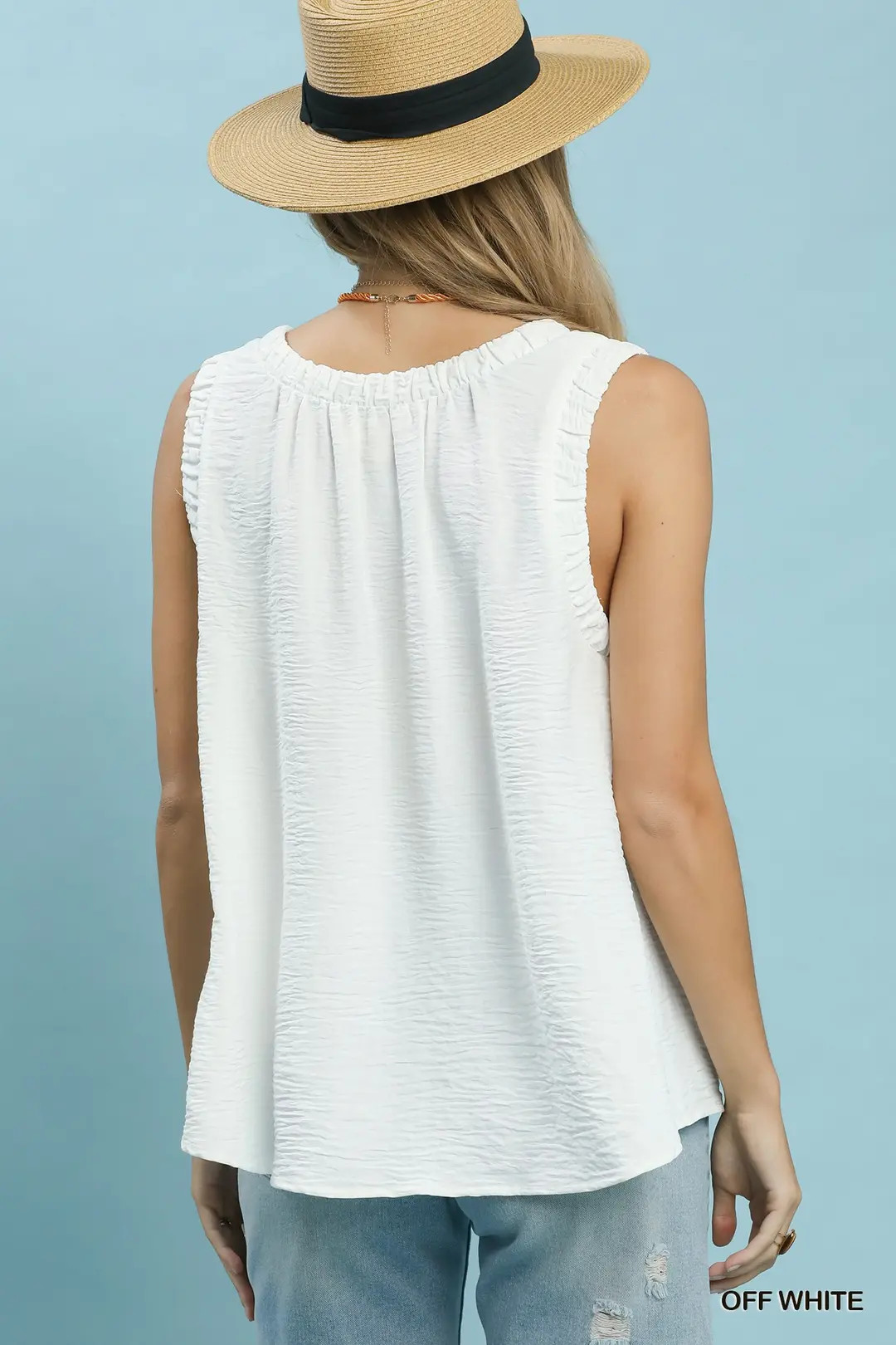 This sleeveless top highlights a delicate ruffle neckline for soft, feminine charm. The subtle ruffle detailing adds romantic dimension, while the streamlined sleeveless design delivers breezy, warm-weather comfort. Made from lightweight fabric, it offers a flattering, relaxed fit and all-day wearability. Effortlessly versatile, it pairs perfectly with jeans, shorts, skirts, and layered outfits for daily casual looks, brunch, and seasonal everyday styling.