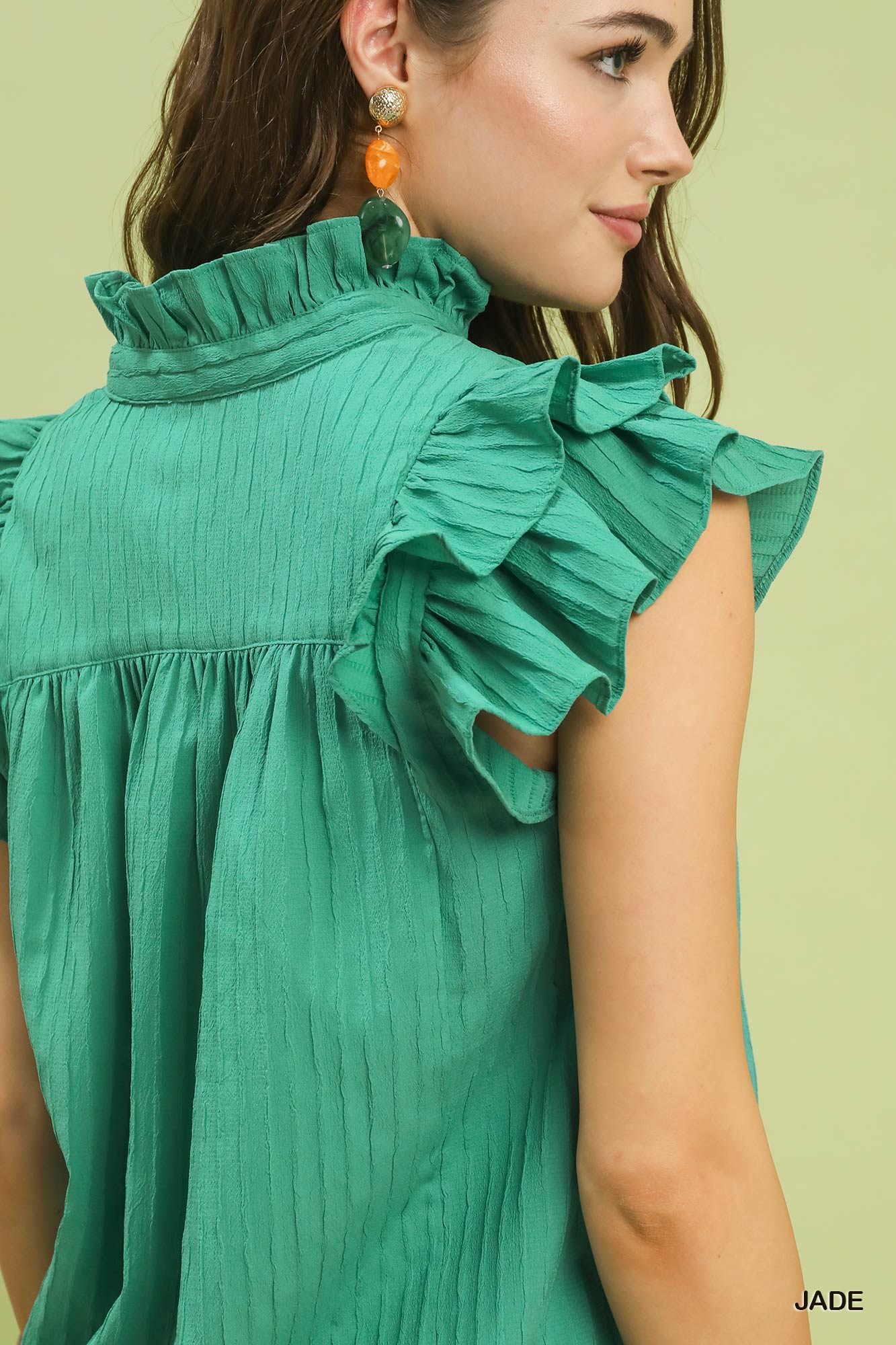 The Ruffle Sleeve Textured Babydoll Top is a charming and feminine piece featuring ruffle sleeves with layered flutter detail for a whimsical touch. With a split V-neckline, this top offers a stylish and flattering neckline that adds interest to the design. The relaxed babydoll silhouette creates a comfortable and flowy fit that is perfect for casual wear. Although not lined, this textured top is lightweight and ideal for layering or wearing during warmer seasons. Elevate your look with this sweet and versatile top that combines trendy ruffle details with a flattering silhouette.