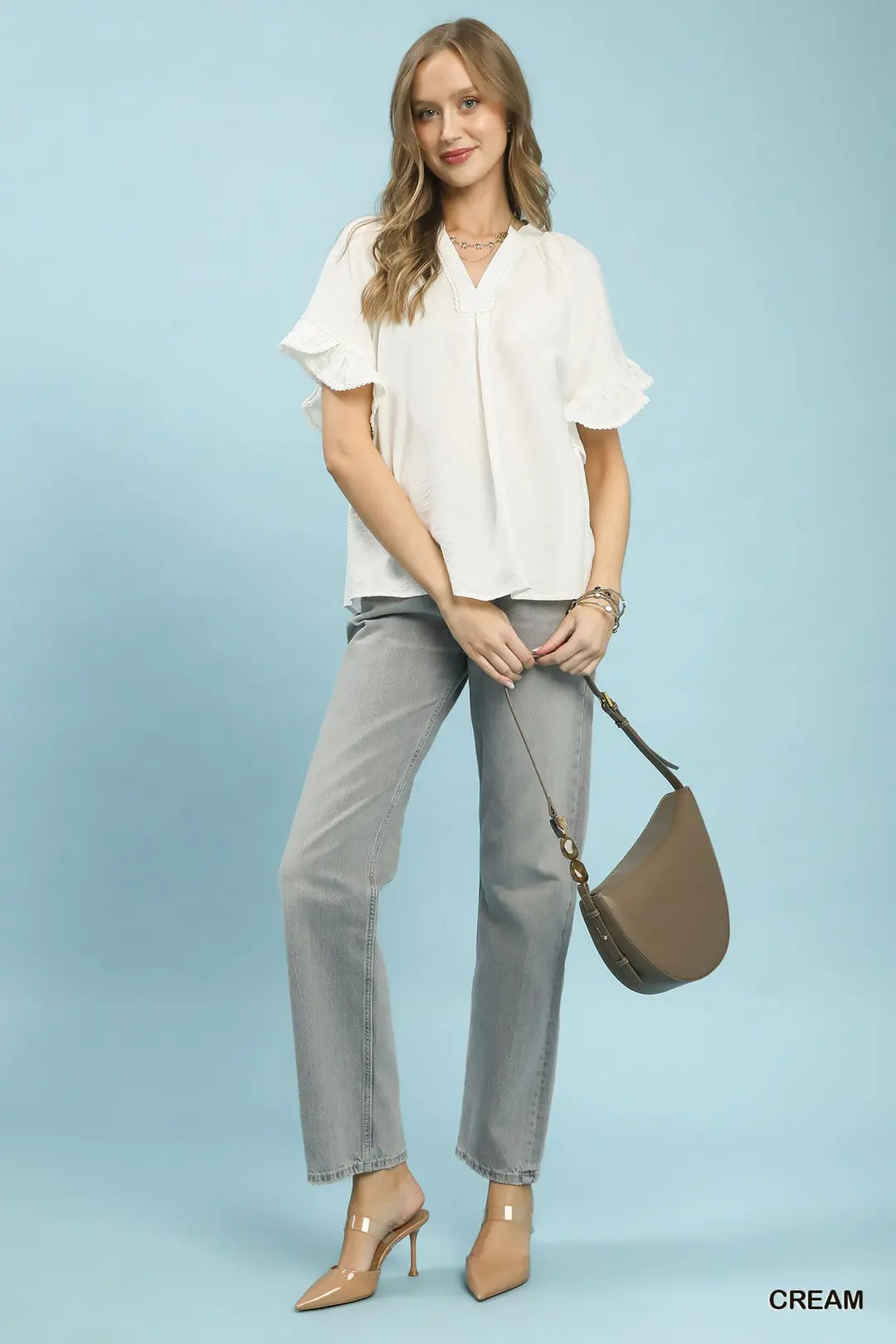This Ruffle Sleeve V-Neck Flutter Top exudes feminine charm with its delicate details. The short flutter sleeves feature a ruffle hem and lace trim, adding a whimsical touch to the top. The V-neck is adorned with delicate lace edging, enhancing its elegant appeal. The high-low hem gives it a modern flair, while the scalloped lace trim at the neckline and sleeves adds a romantic finish. Please note that this top is not lined and offers a lightweight and airy feel for all-day comfort. Elevate your wardrobe with this beautifully detailed top that is perfect for adding a touch of charm to any outfit.