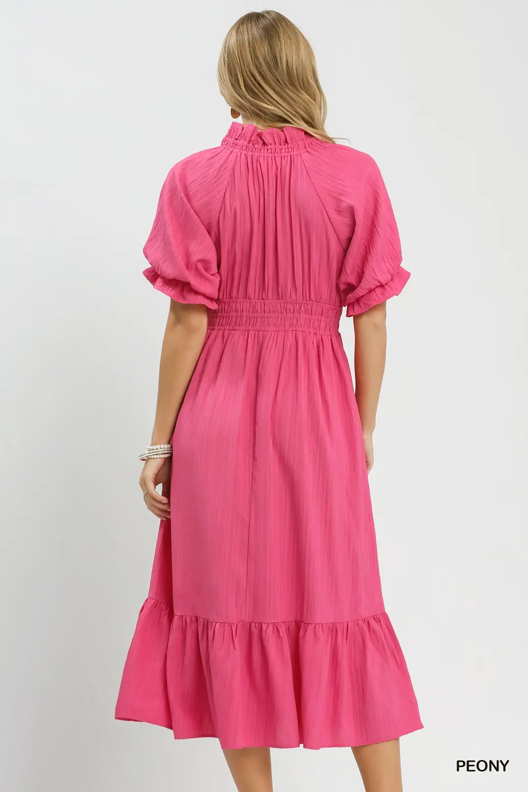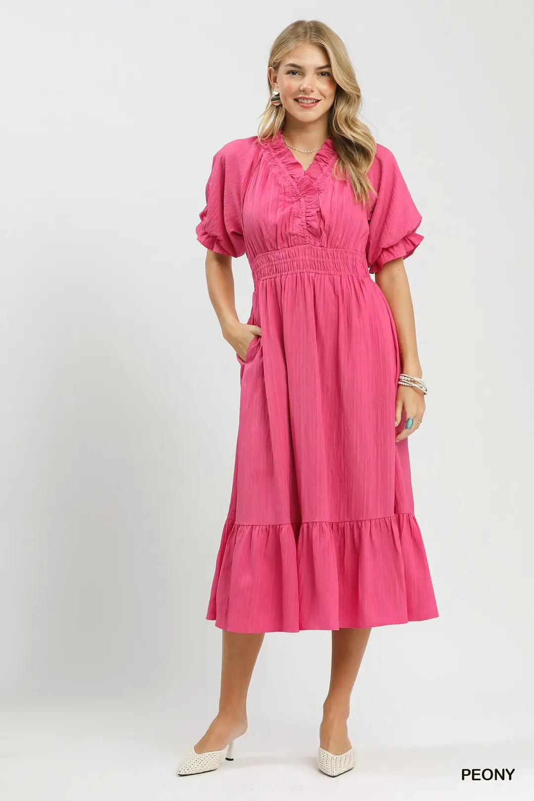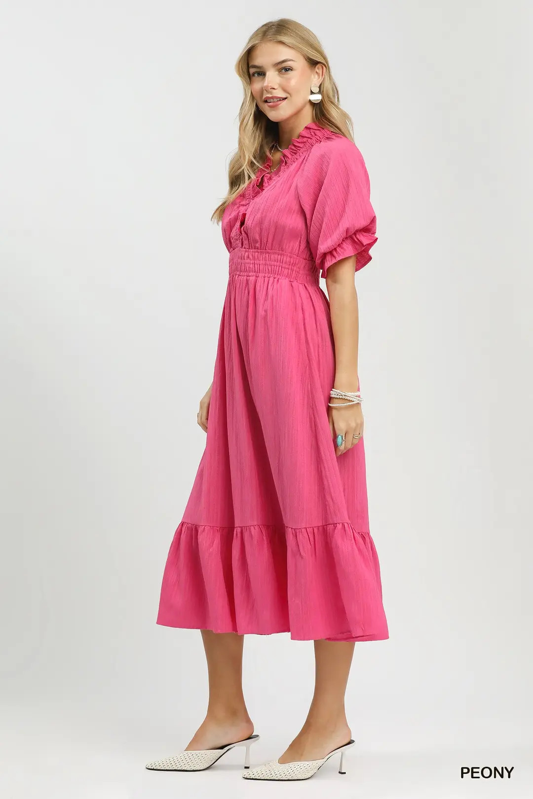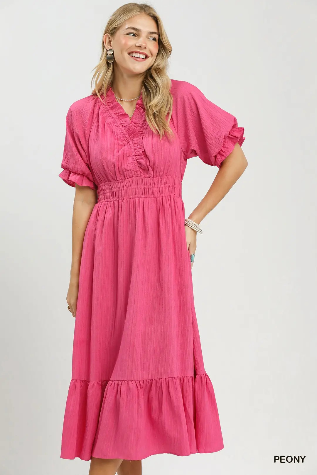 This feminine midi dress features a delicate ruffle-trimmed V-neckline that adds soft romantic detail to its elegant silhouette. Designed in a flattering midi length with a breezy, flowy fit, it offers both comfort and timeless style. The subtle ruffle accents enhance its gentle charm, making it a versatile piece for brunch, daytime events, vacation outings, and casual semi-formal occasions. Easy to dress up or down, it effortlessly combines grace with everyday wearability.