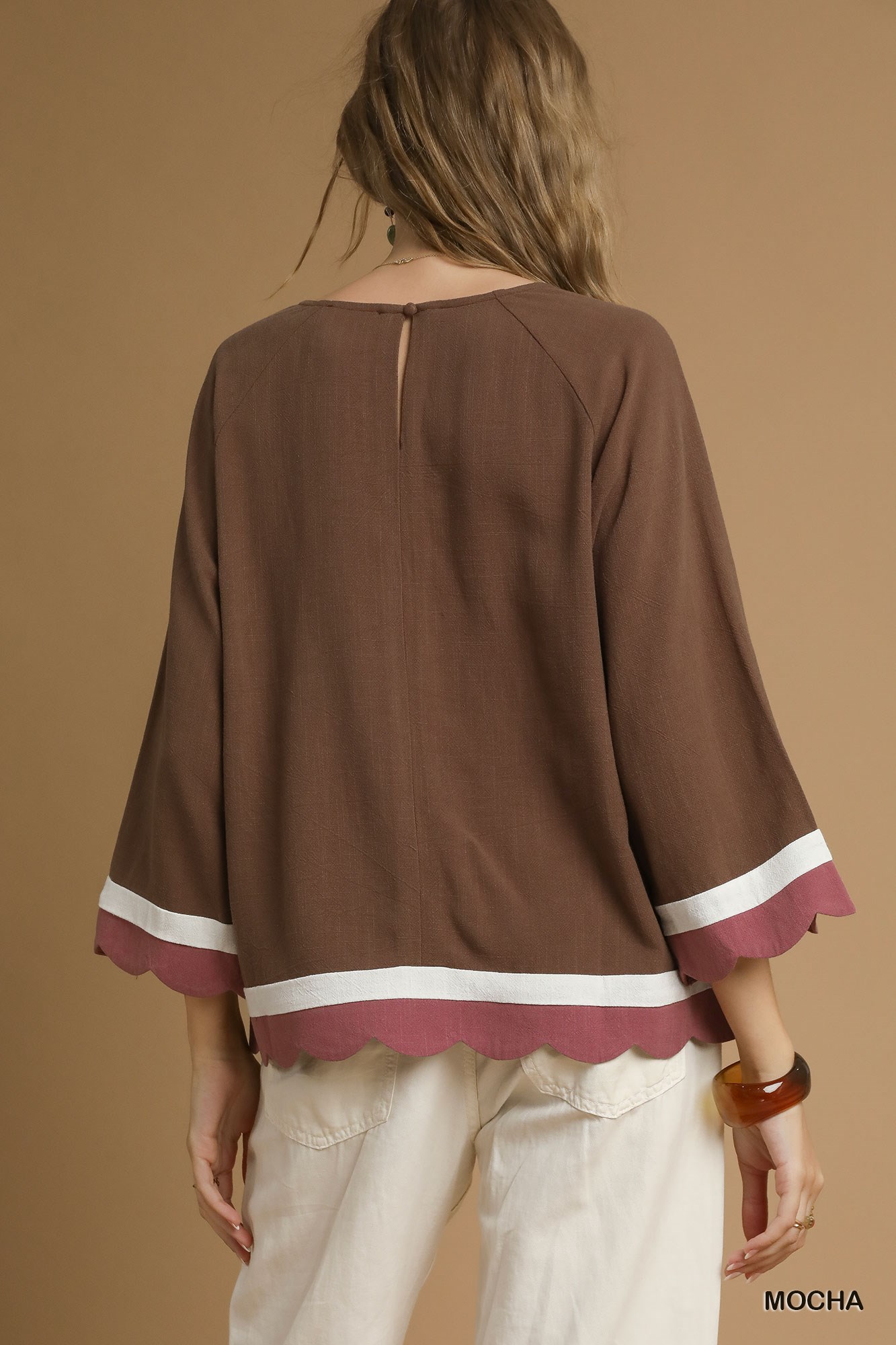 Make a stylish statement with this Scalloped Hem Color Block Top. The color block design adds a modern and eye-catching element to the top, creating a bold and trendy look. The scalloped hem detail provides a unique and elegant touch, adding a feminine flair to the overall design. With its combination of colors and textures, this top is perfect for adding dimension and visual interest to your outfit. Pair it with jeans or trousers for a chic and contemporary ensemble that is sure to turn heads. This Scalloped Hem Color Block Top is a versatile and fashionable piece that can easily take you from day to night with effortless style.