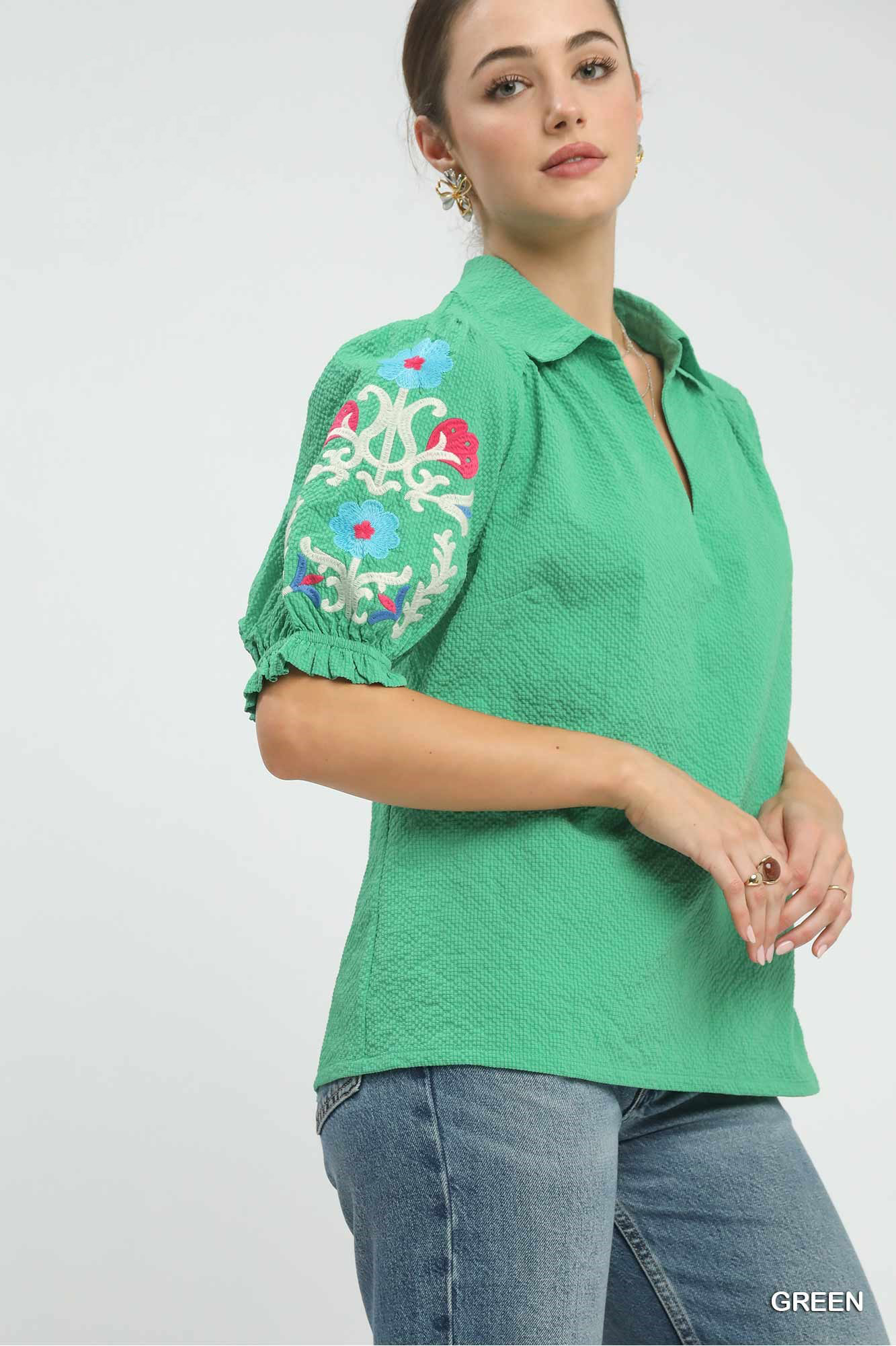 The Seersucker Embroidered Sleeve Blouse is a stylish and comfortable choice for any occasion. Made from lightweight seersucker fabric, it is perfect for warm weather wear. The open point collar neckline adds a touch of sophistication to the design. The embroidered short sleeves bring a charming and unique detail to the blouse. With a relaxed and easy fit, this blouse is both flattering and versatile. It is unlined for a breezy and breathable feel, making it ideal for all-day comfort.