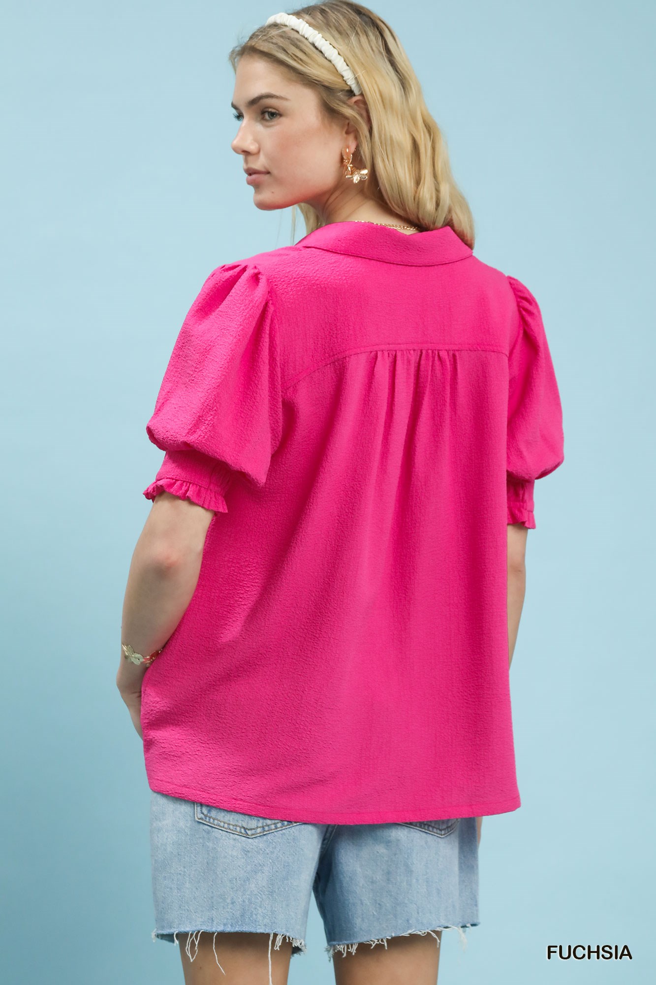 Introducing the Seersucker Puff Sleeve Blouse, a charming addition to your wardrobe. Crafted from seersucker fabric, this blouse offers a textured and stylish look that is perfect for the season. The split V-neck design adds a modern flair to the top, enhancing its overall appeal. Featuring short puff sleeves with elastic cuffs, this blouse combines comfort with a touch of trendiness. Please note that this blouse is not lined, offering a lightweight and breathable feel ideal for warm weather. Elevate your style with this timeless and fashionable piece.