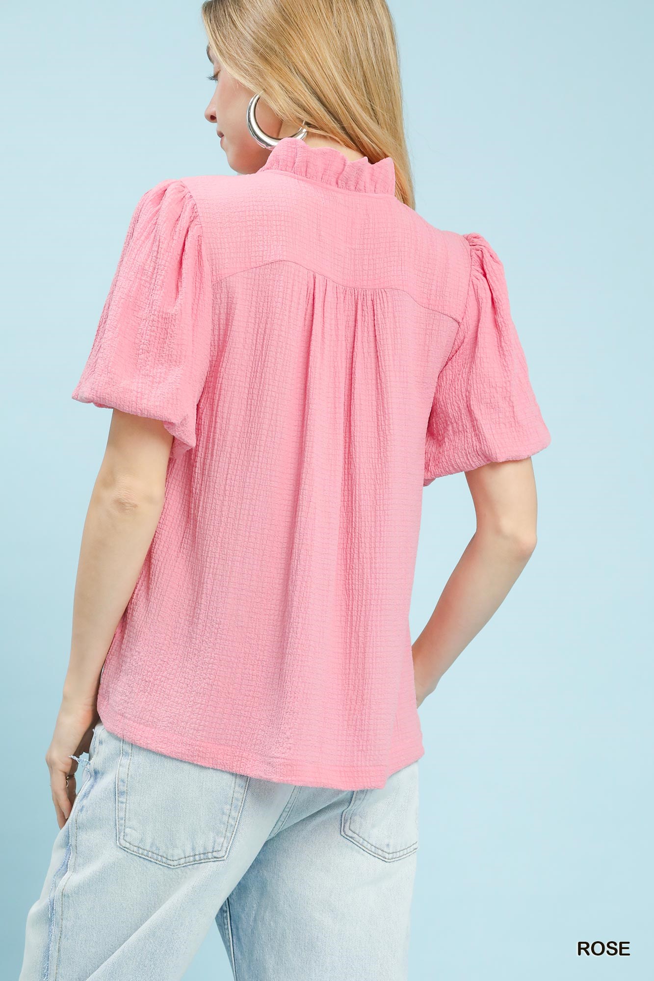 This blouse is crafted from seersucker fabric, known for its textured and puckered finish. It features a split V-neckline that adds a touch of sophistication to the design. The short puff sleeves offer a feminine and on-trend look. Pleat details enhance the blouse's overall texture and visual interest. Please note that this blouse is not lined, providing a lightweight and breathable feel for warmer days.