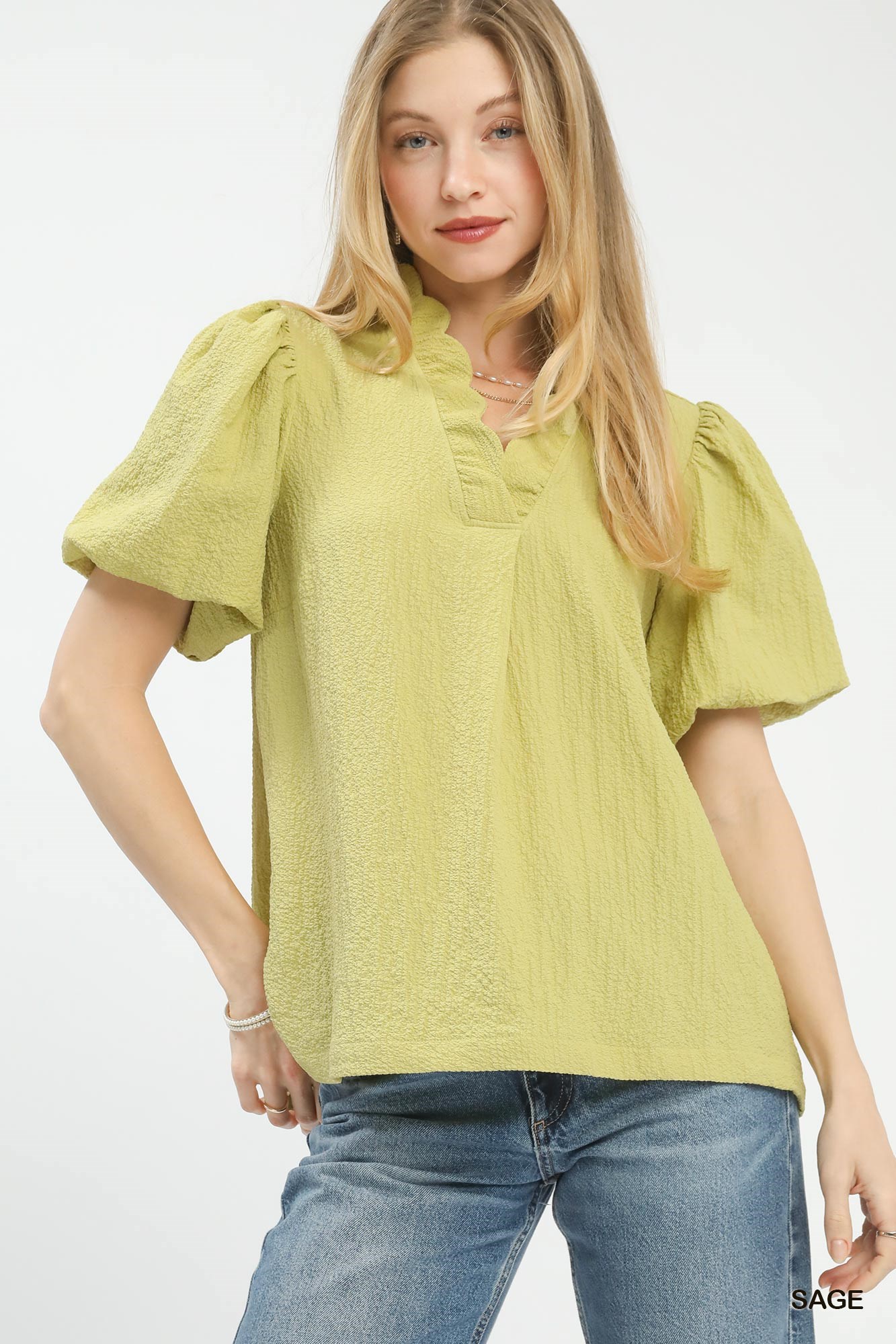 This blouse is crafted from seersucker fabric, known for its textured and puckered finish. It features a split V-neckline that adds a touch of sophistication to the design. The short puff sleeves offer a feminine and on-trend look. Pleat details enhance the blouse's overall texture and visual interest. Please note that this blouse is not lined, providing a lightweight and breathable feel for warmer days.