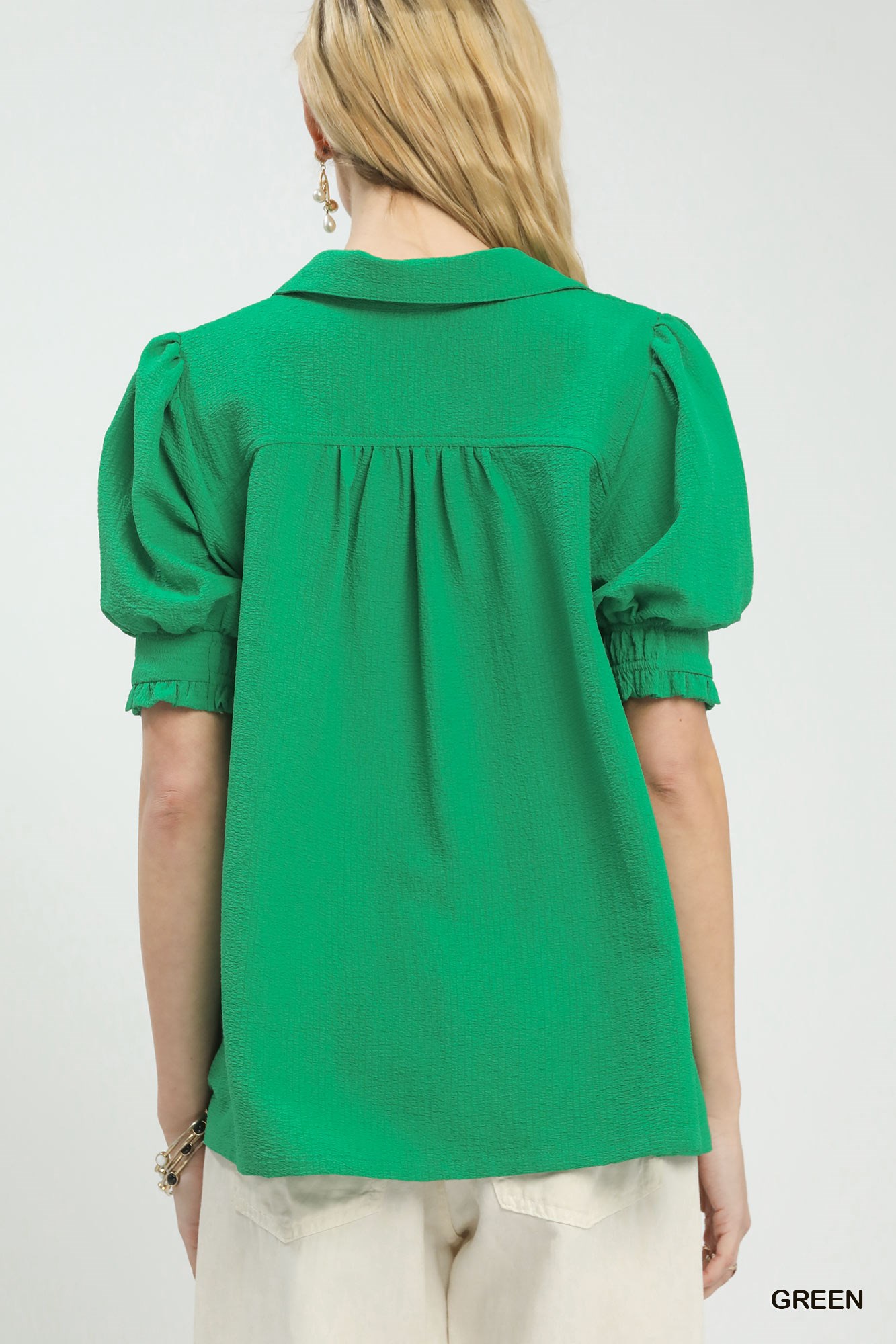 Introducing the Seersucker Puff Sleeve Blouse, a charming addition to your wardrobe. Crafted from seersucker fabric, this blouse offers a textured and stylish look that is perfect for the season. The split V-neck design adds a modern flair to the top, enhancing its overall appeal. Featuring short puff sleeves with elastic cuffs, this blouse combines comfort with a touch of trendiness. Please note that this blouse is not lined, offering a lightweight and breathable feel ideal for warm weather. Elevate your style with this timeless and fashionable piece.