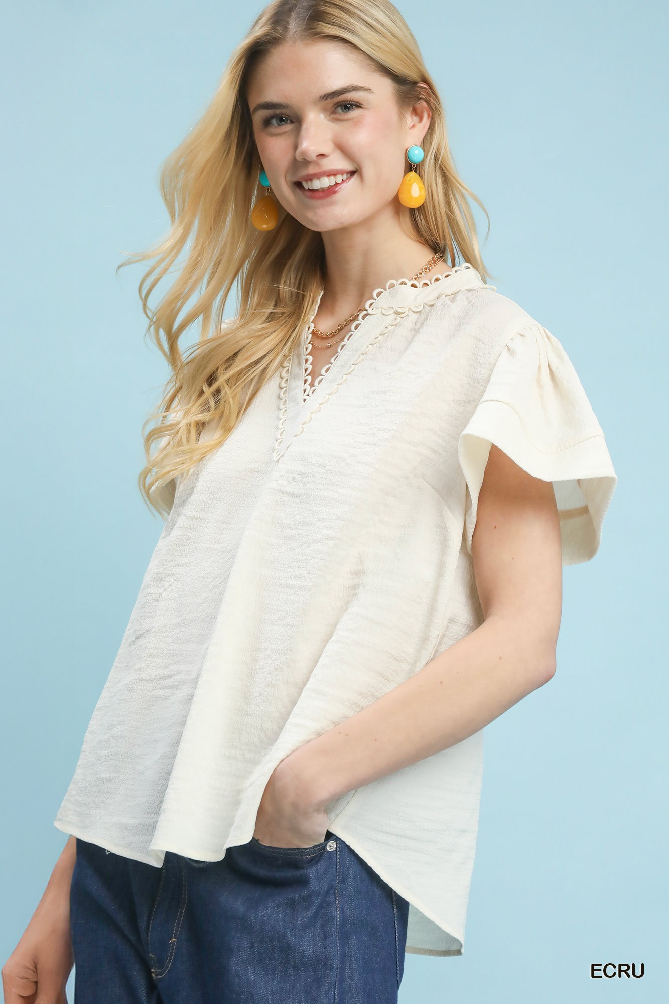 Introducing the Seersucker Short Sleeve Top, a perfect blend of charm and comfort for the season. Crafted from seersucker fabric with delicate lace trim, this top exudes a classic yet feminine aesthetic. The split V-neck with scalloped trim detail adds an elegant touch to the design. Flutter-style sleeves enhance the breezy feel of this top, making it a stylish choice for any casual outing. With its lightweight construction, this top will keep you cool and stylish all day long.