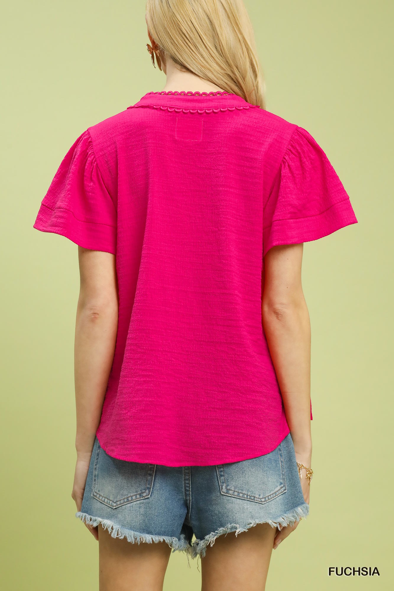 Introducing the Seersucker Short Sleeve Top, a perfect blend of charm and comfort for the season. Crafted from seersucker fabric with delicate lace trim, this top exudes a classic yet feminine aesthetic. The split V-neck with scalloped trim detail adds an elegant touch to the design. Flutter-style sleeves enhance the breezy feel of this top, making it a stylish choice for any casual outing. With its lightweight construction, this top will keep you cool and stylish all day long.