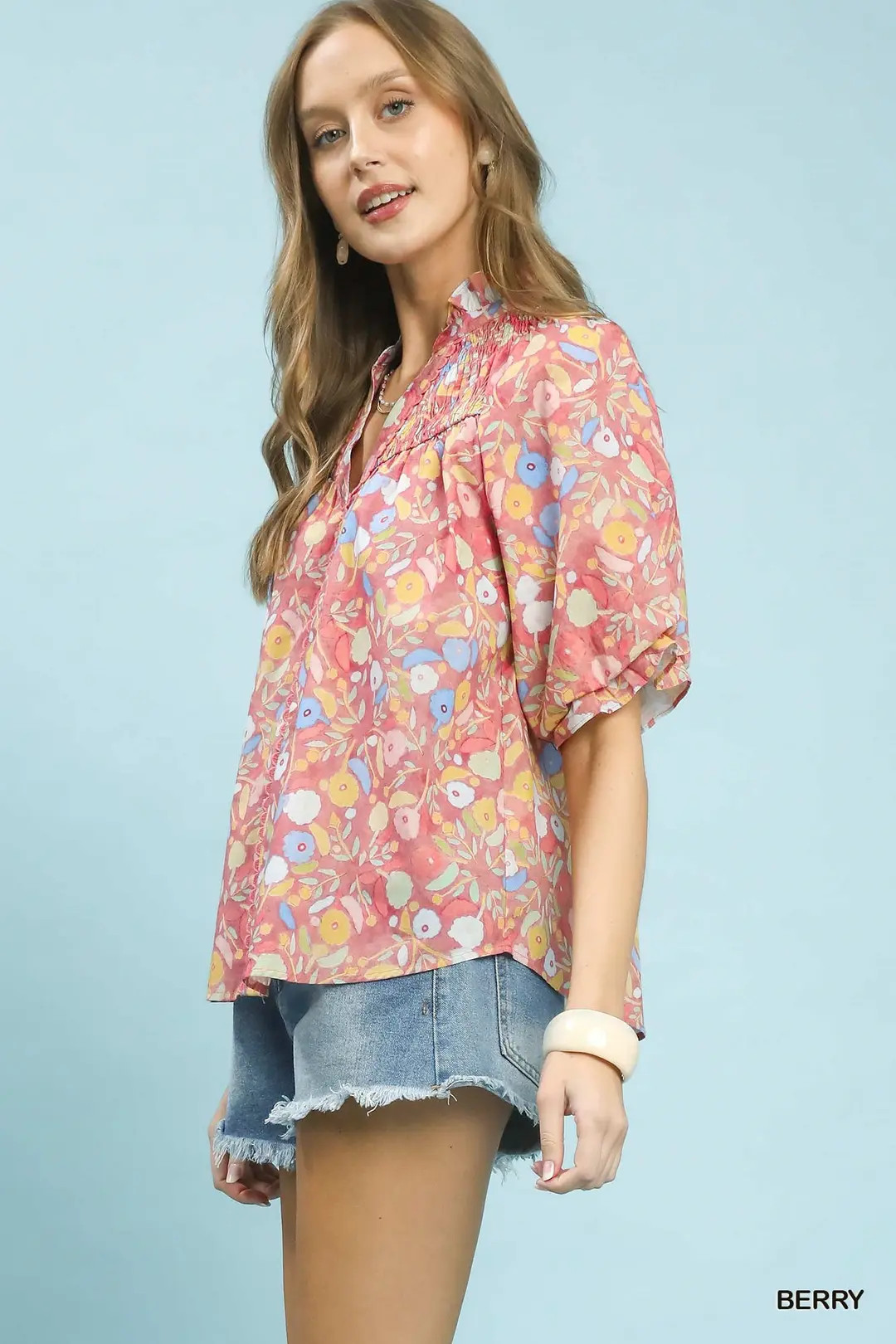 Umgee Smocked Floral Ruffle Trim Top