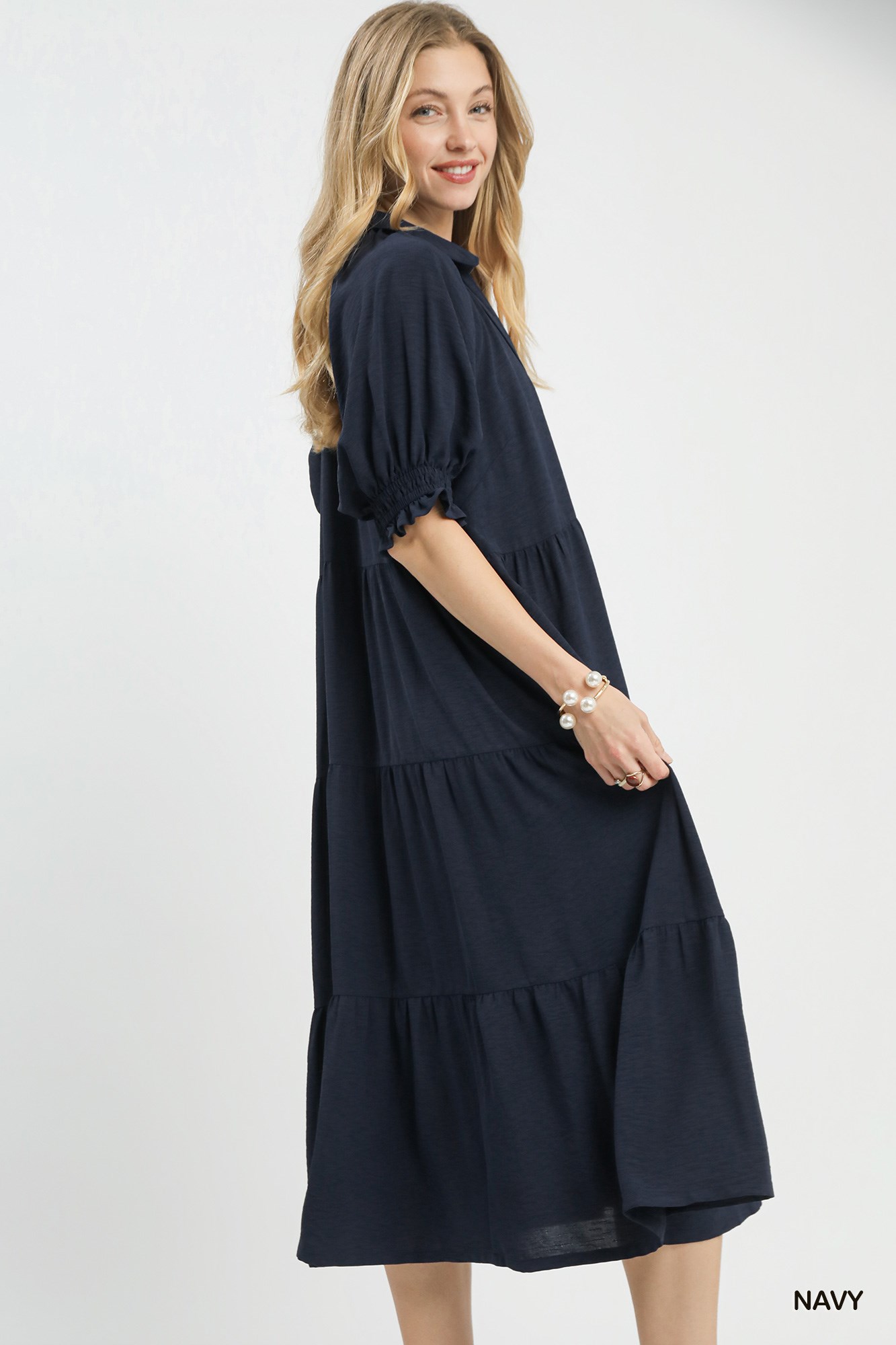 This Solid Tiered Midi Dress features a flattering V-neck with a charming collar detail for a touch of sophistication. The puff sleeves add a stylish and feminine touch to the dress. With its midi length and multi-tiered design, this dress exudes a trendy and flowy silhouette. Note that the dress is not lined, adding to its lightweight and breathable feel. Elevate your wardrobe with this chic and versatile dress for a fashionable and elegant ensemble.