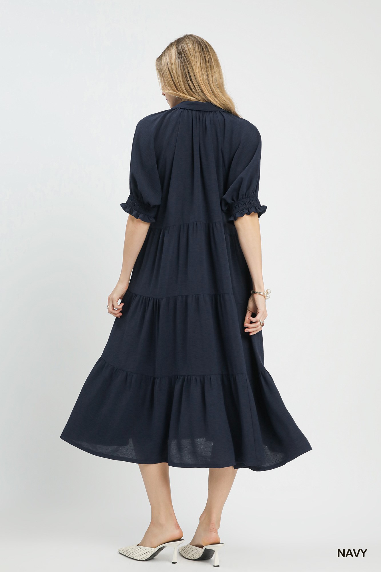 This Solid Tiered Midi Dress features a flattering V-neck with a charming collar detail for a touch of sophistication. The puff sleeves add a stylish and feminine touch to the dress. With its midi length and multi-tiered design, this dress exudes a trendy and flowy silhouette. Note that the dress is not lined, adding to its lightweight and breathable feel. Elevate your wardrobe with this chic and versatile dress for a fashionable and elegant ensemble.