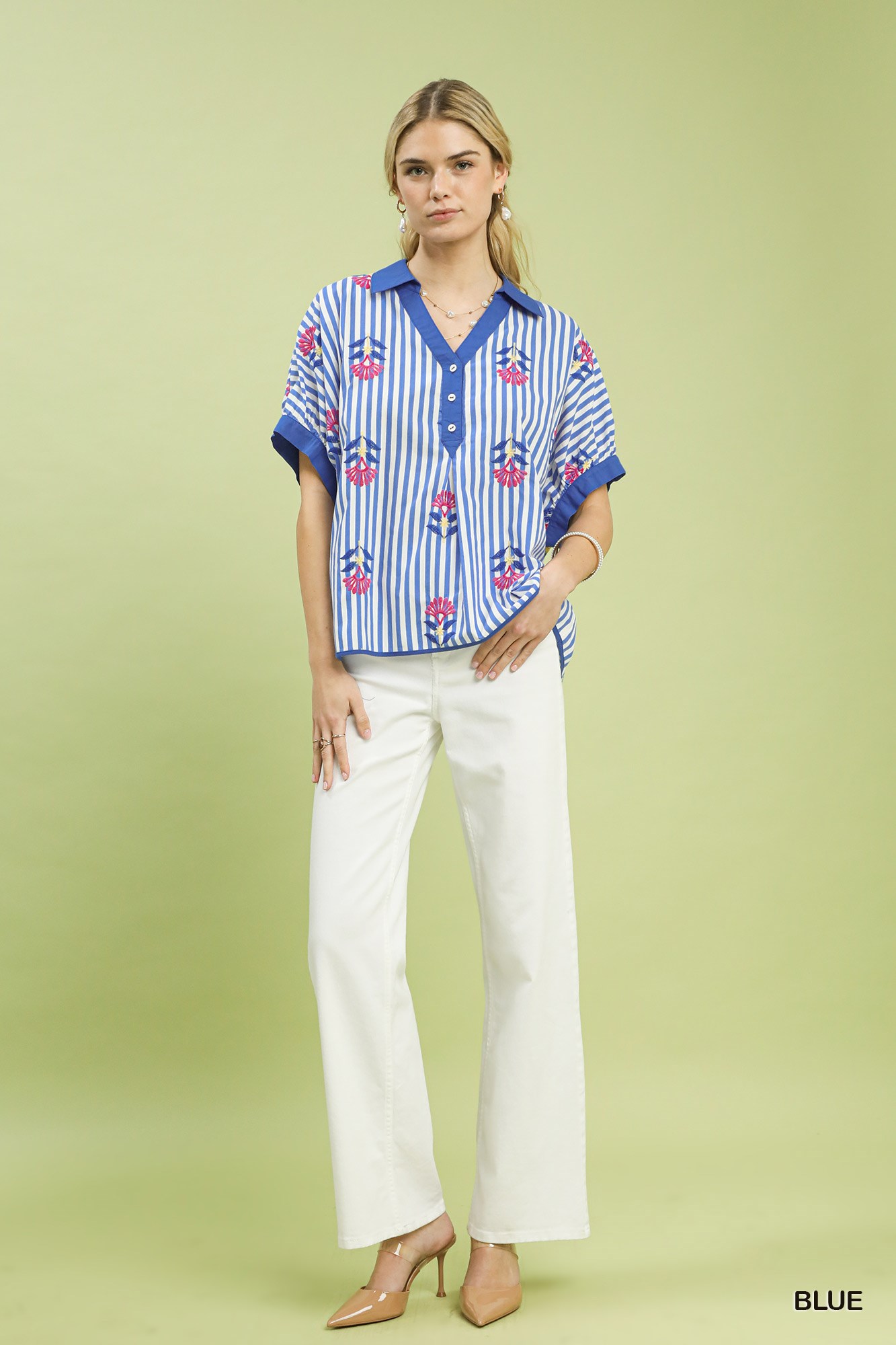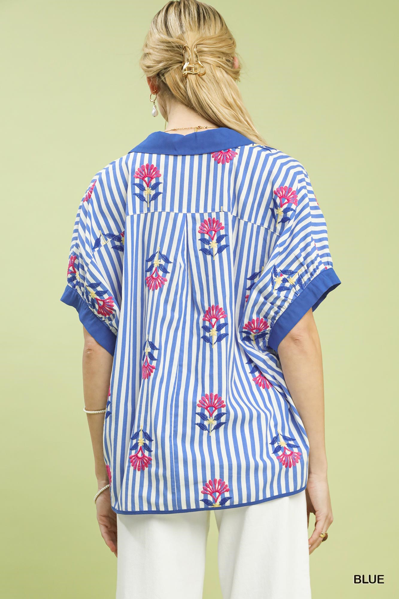 Umgee Stripe Embroidered Button-Front Boho Blouse