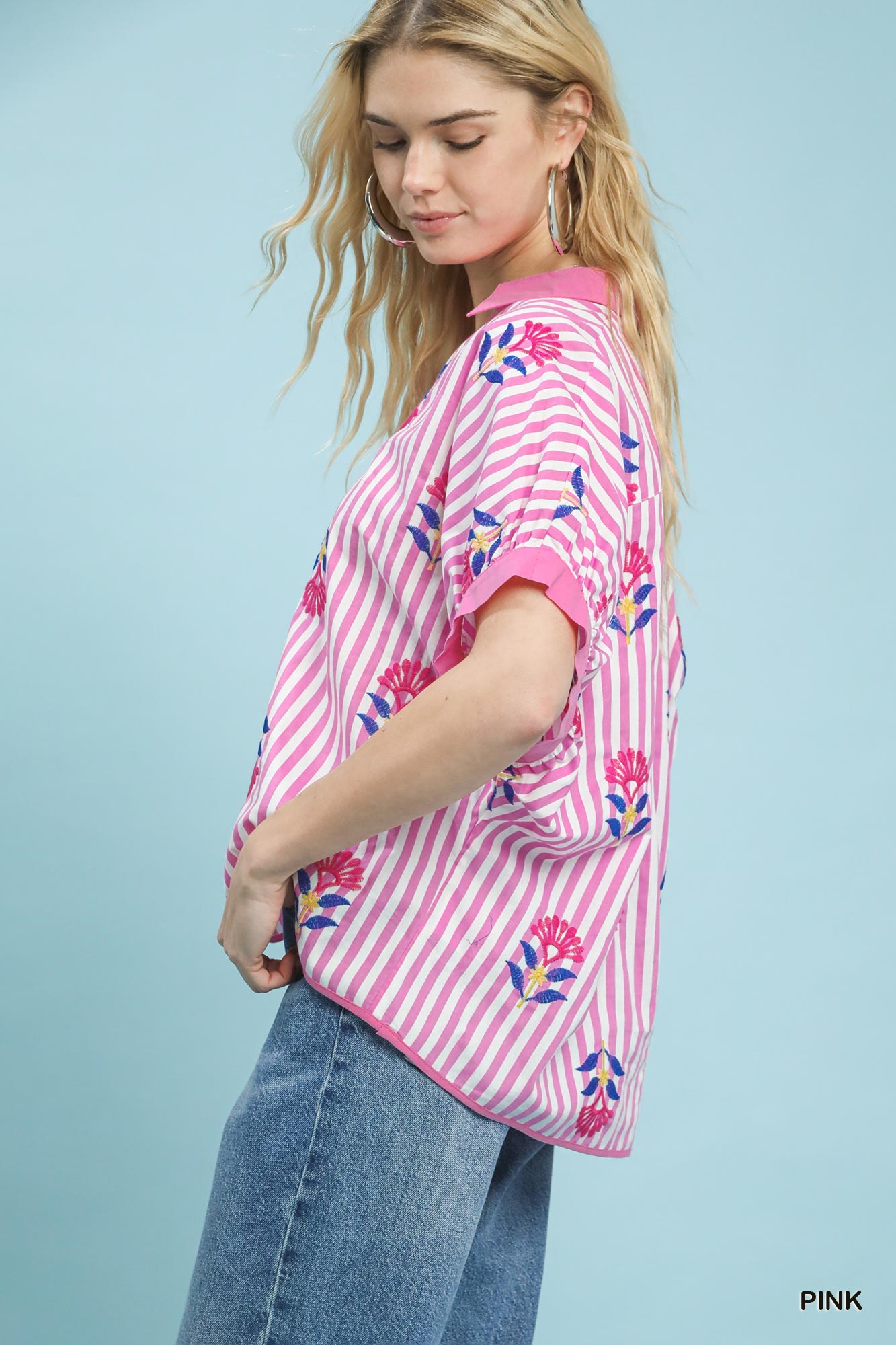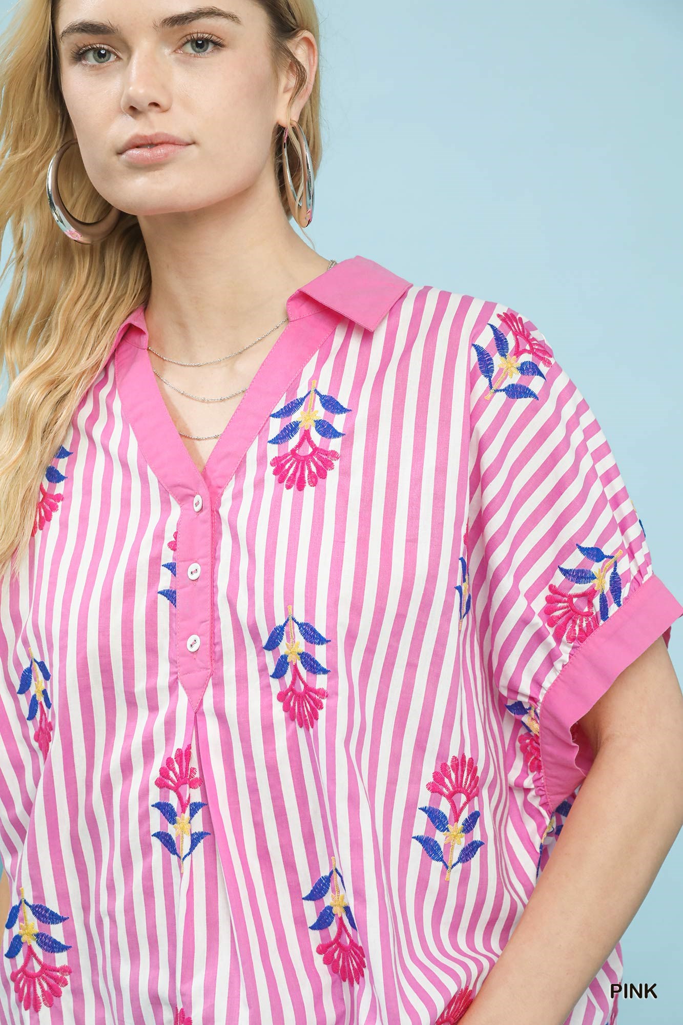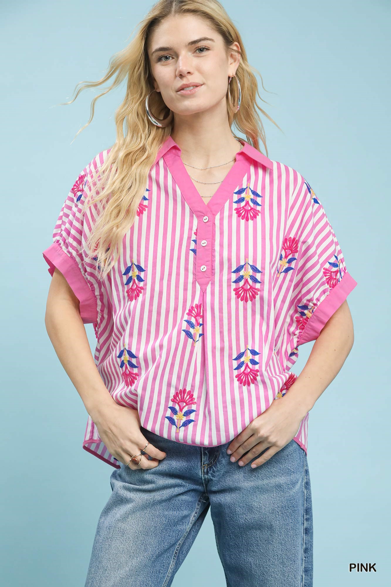 This stripe embroidered button-front boho top features a split V-neck with button detail, adding a touch of casual elegance. The vertical stripes with floral embroidery create a chic and bohemian vibe. Short dolman sleeves with cuffs offer a relaxed and comfortable fit. This oversized top is perfect for effortless and laid-back styling. While not lined, this top is ideal for layering and versatile for various occasions.