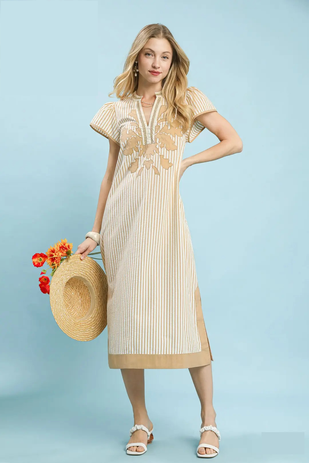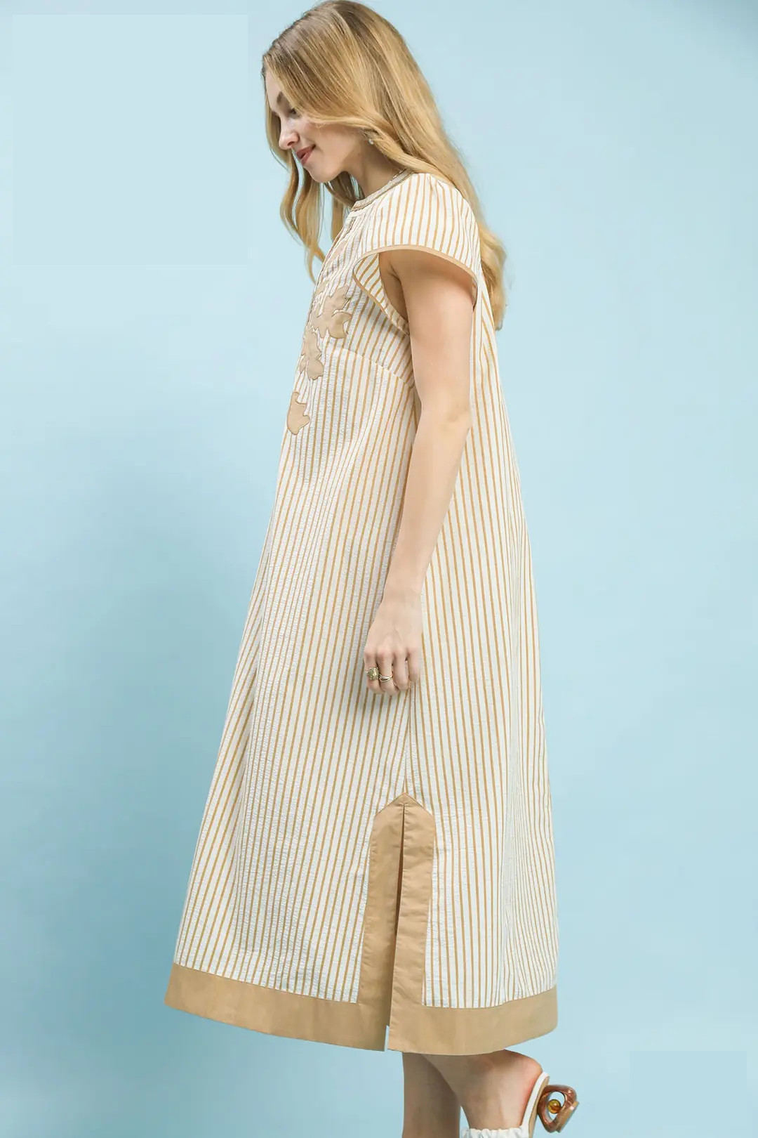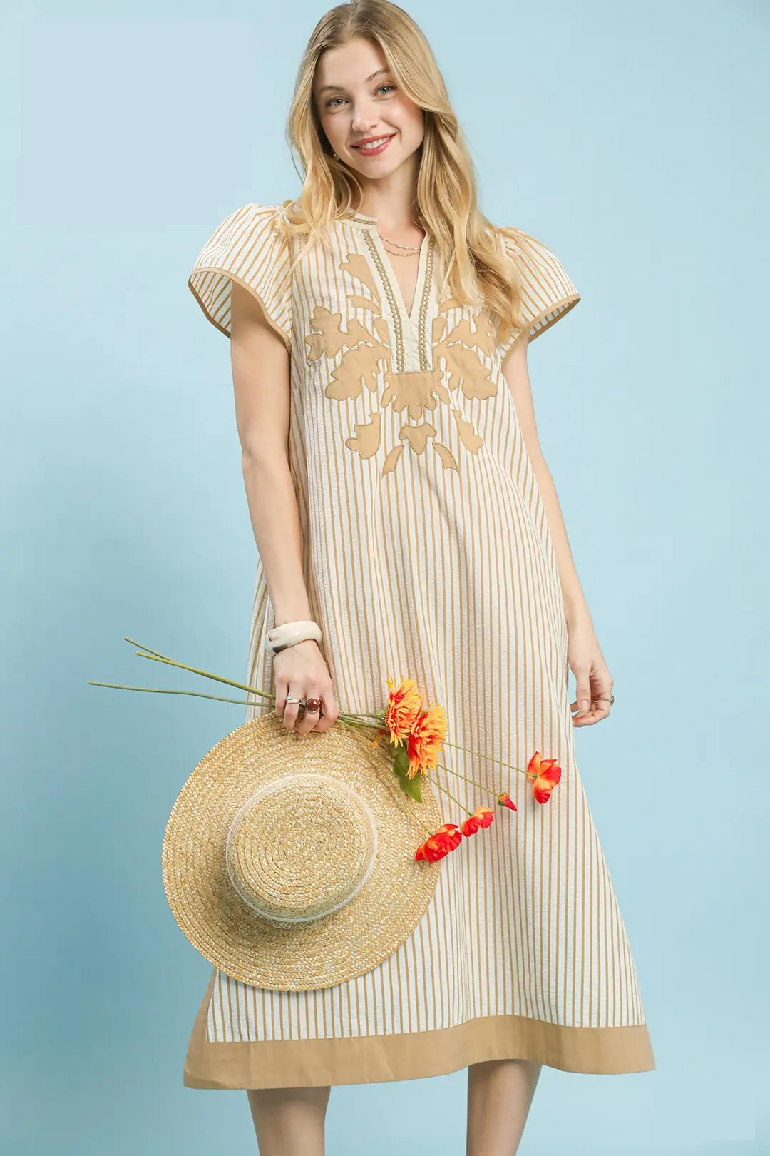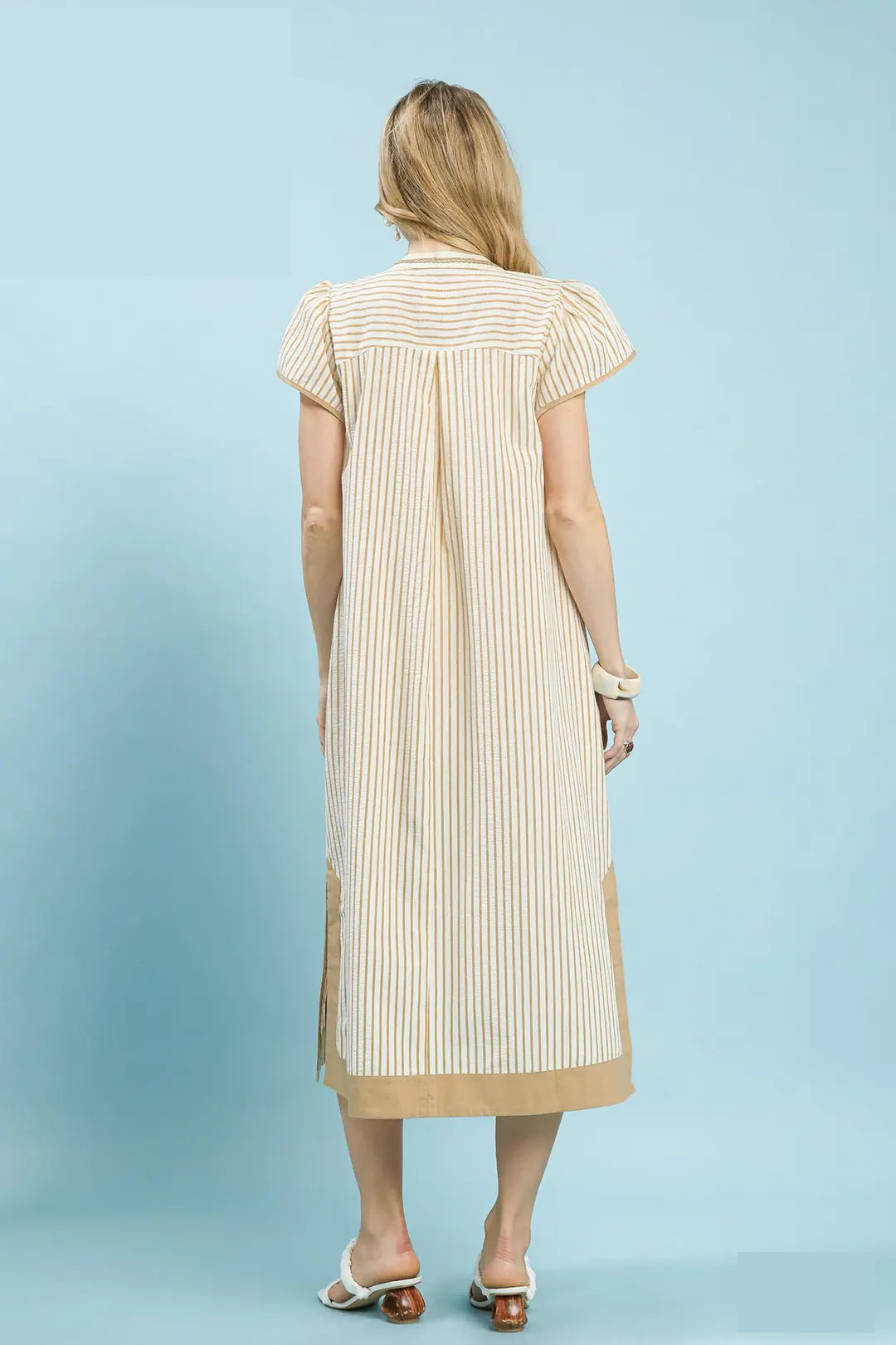 This elegant midi dress showcases a refined pinstripe pattern, accented with delicate lace trim for a soft, romantic finish. It features a flattering split V-neck adorned with scalloped trim, paired with short flutter sleeves finished with a clean piped edge. Contrast trim and subtle applique details add subtle texture and visual interest, while the unlined design ensures a lightweight, breathable fit ideal for daytime events, brunch, or warm-weather gatherings.
