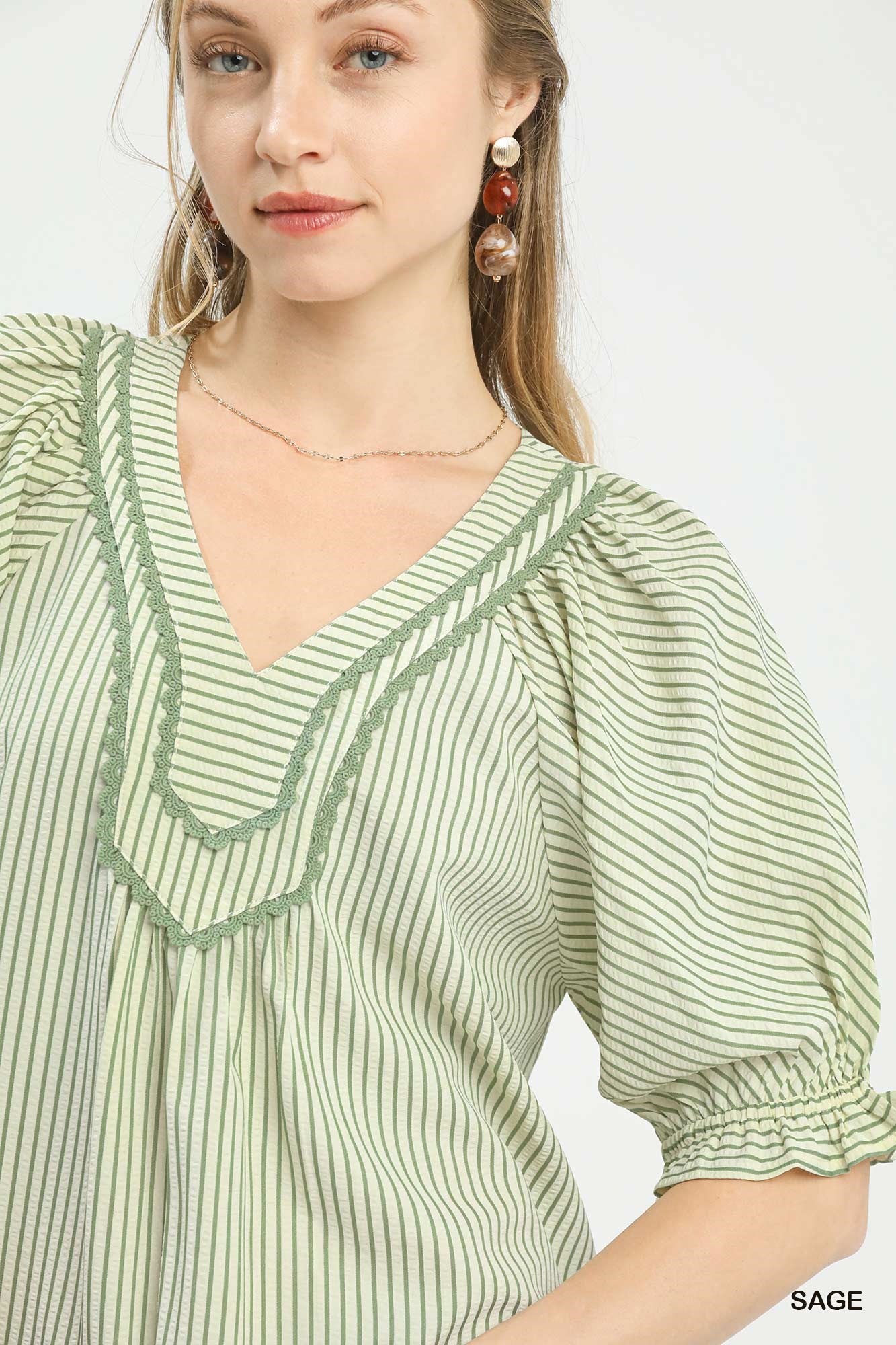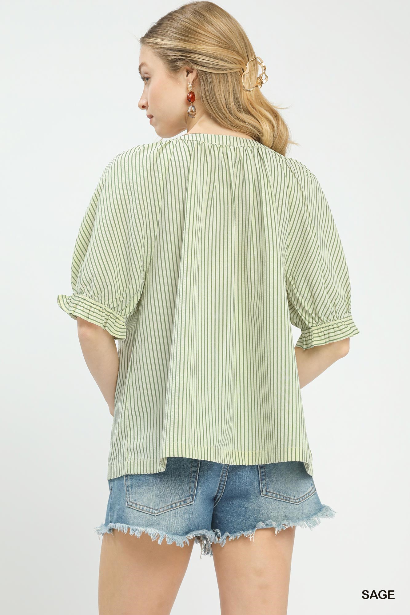 A stripe V-neck top is a timeless and versatile piece that combines classic stripes with a flattering V-neckline. The stripes add a chic and effortless appeal to the top, while the V-neck design elongates the neckline and creates a flattering silhouette. This style is perfect for both casual and dressed-up looks, making it a versatile wardrobe essential. Pairing the stripe V-neck top with jeans for a casual outing or with trousers for a more polished ensemble can result in a stylish and put-together outfit. Overall, a stripe V-neck top is a versatile and stylish option that can be easily incorporated into various outfits for a classic and on-trend look.