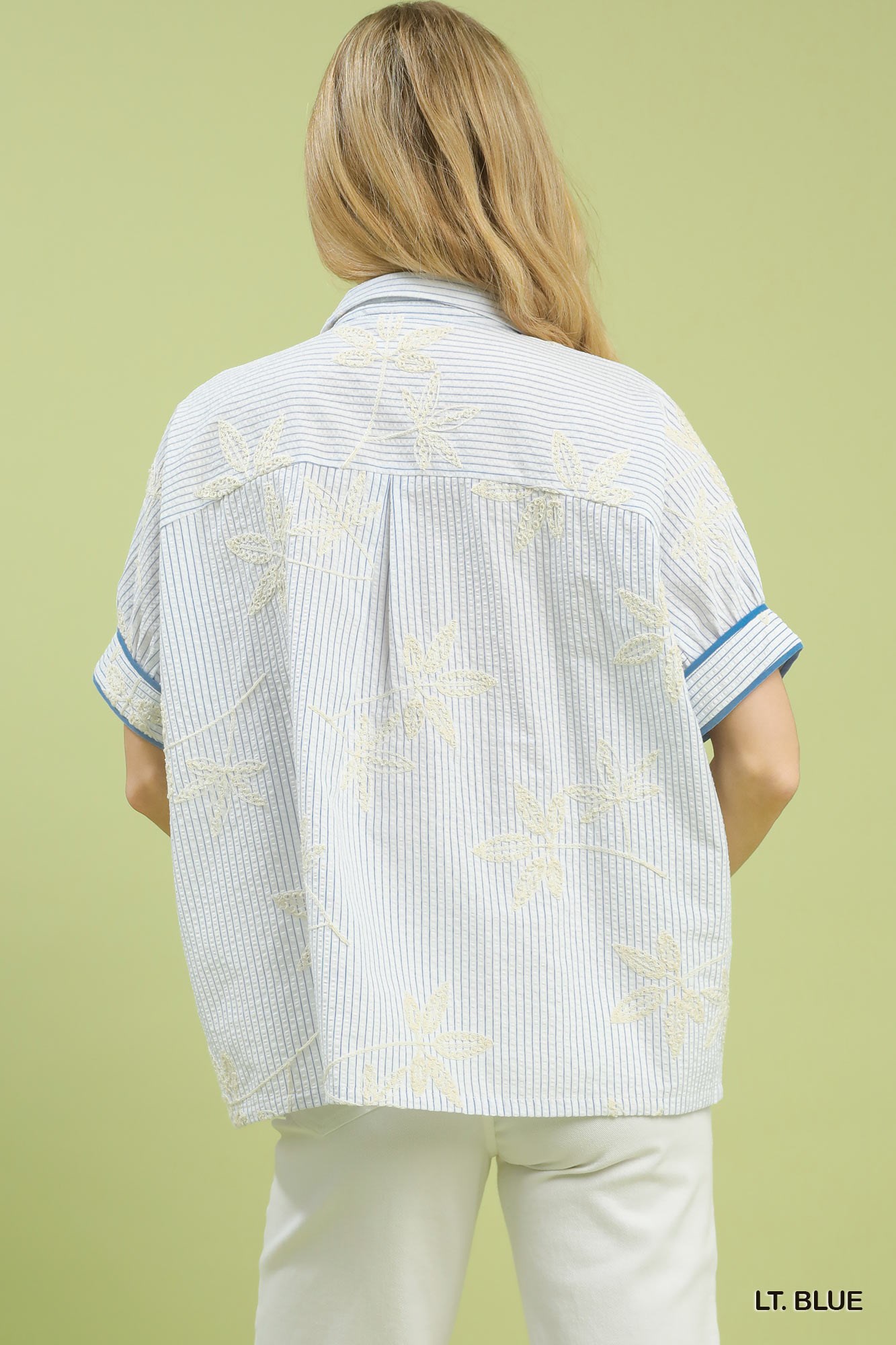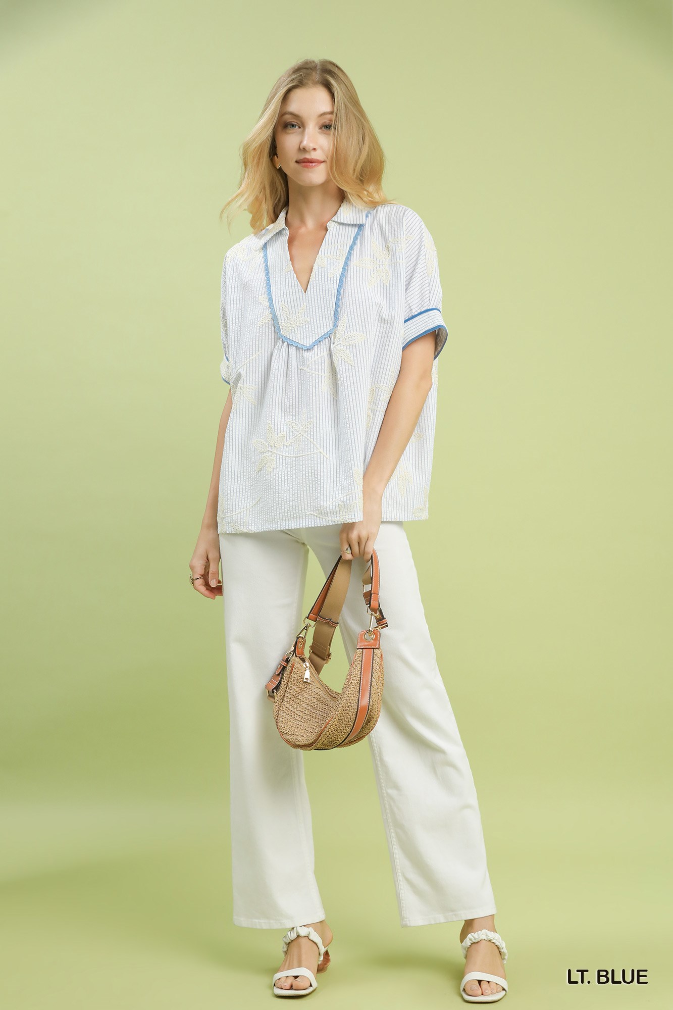 Elevate your wardrobe with this Striped Embroidered Blouse featuring intricate embroidery for a touch of sophistication. The relaxed fit of the blouse provides comfort while maintaining a stylish look. The split V-neck with scallop trim detail adds a feminine and elegant touch to the design. Short cuffed sleeves and lace trim further enhance the blouse's overall charm and uniqueness. Please note that this blouse is not lined, ensuring a light and breezy feel for wearing in various settings.