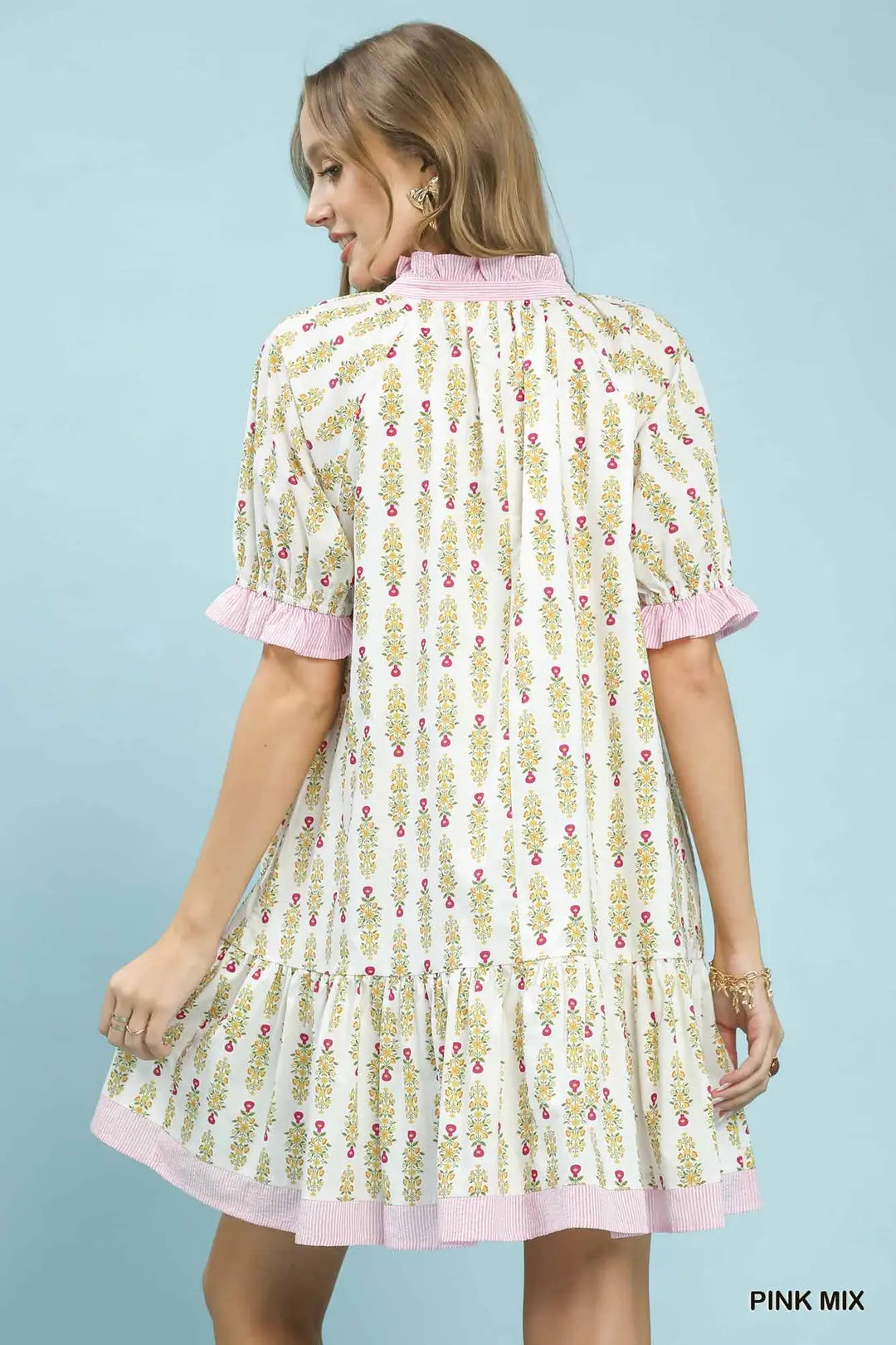 This sweet mini dress features a fresh floral print complemented by clean striped trim, creating a lively and eye-catching contrast. Designed with a flowy tiered silhouette for gentle movement, it balances soft romance with modern detailing. Lightweight and flattering, it’s perfect for daytime outings, vacations, brunch, and warm-weather casual wear.
