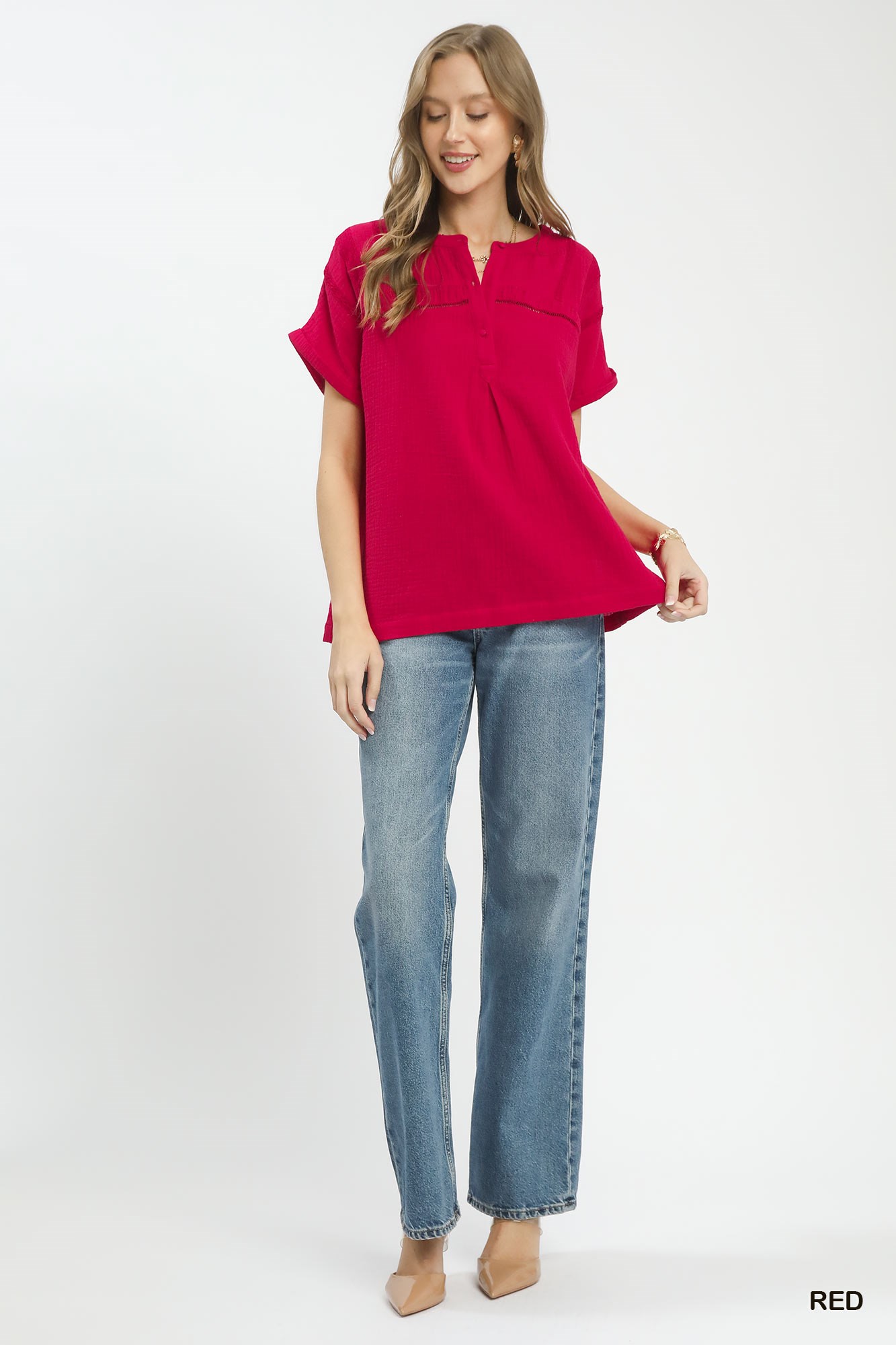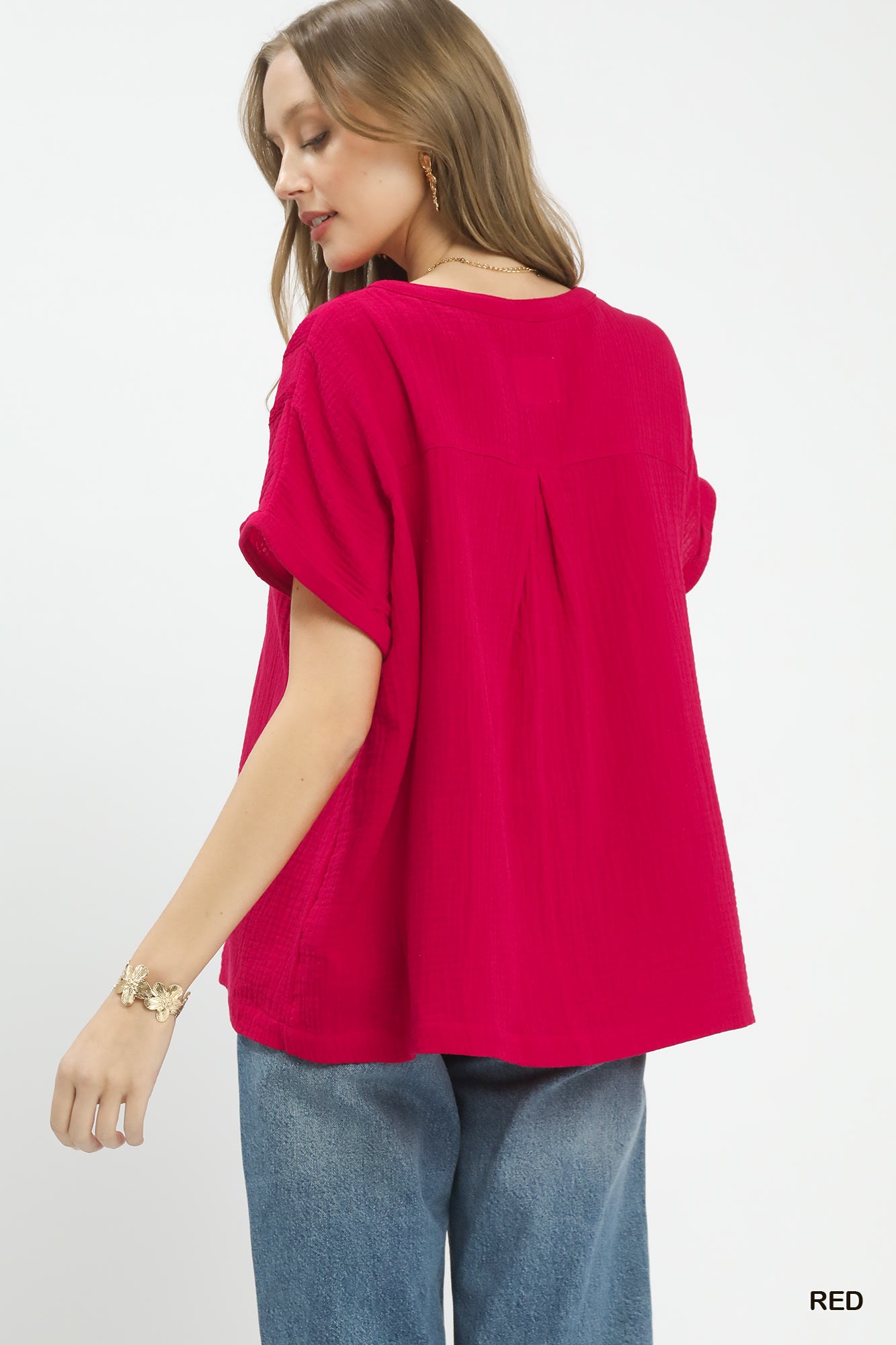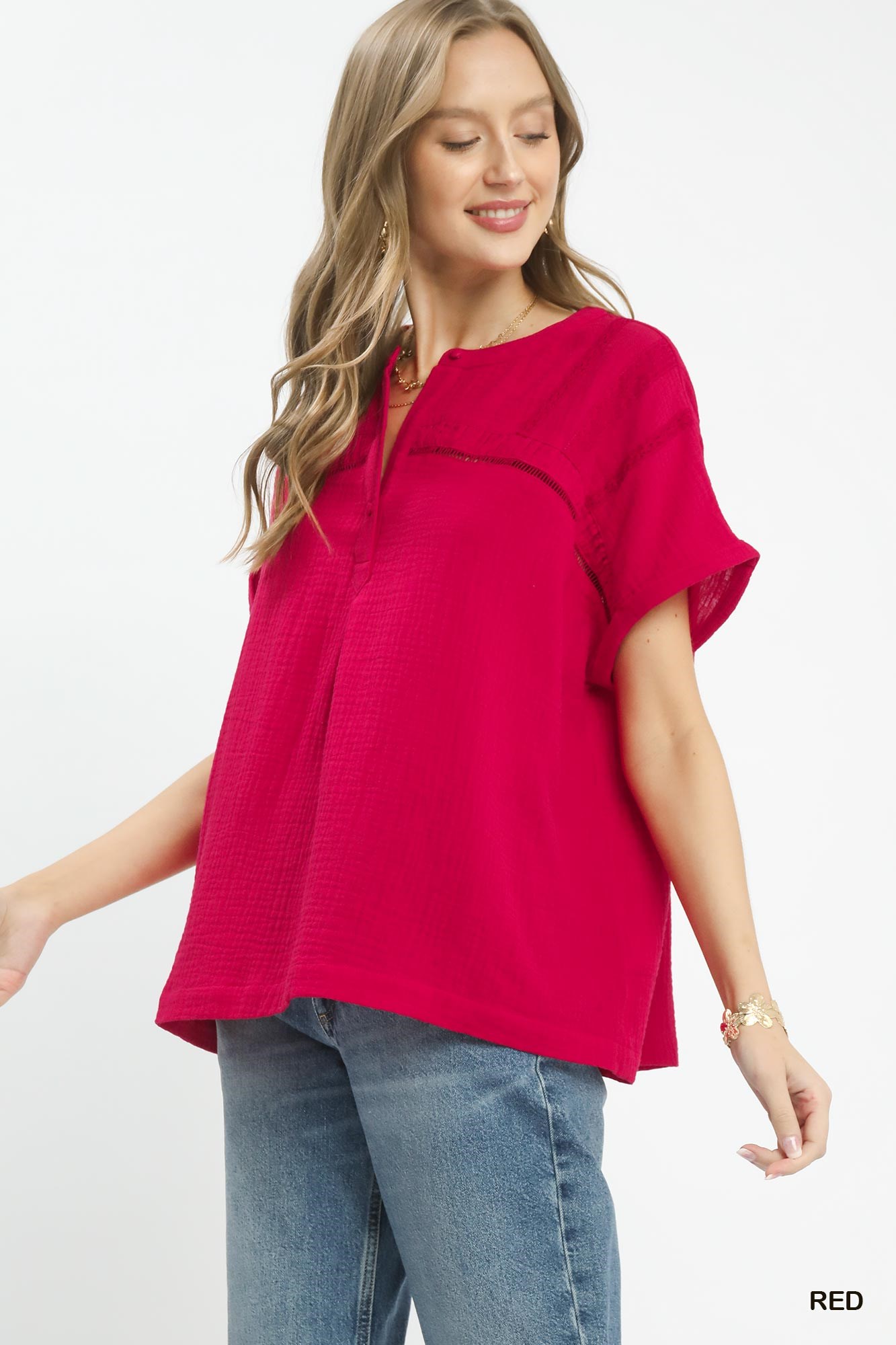 Umgee Textured Gauze Split-Neck Boho Blouse