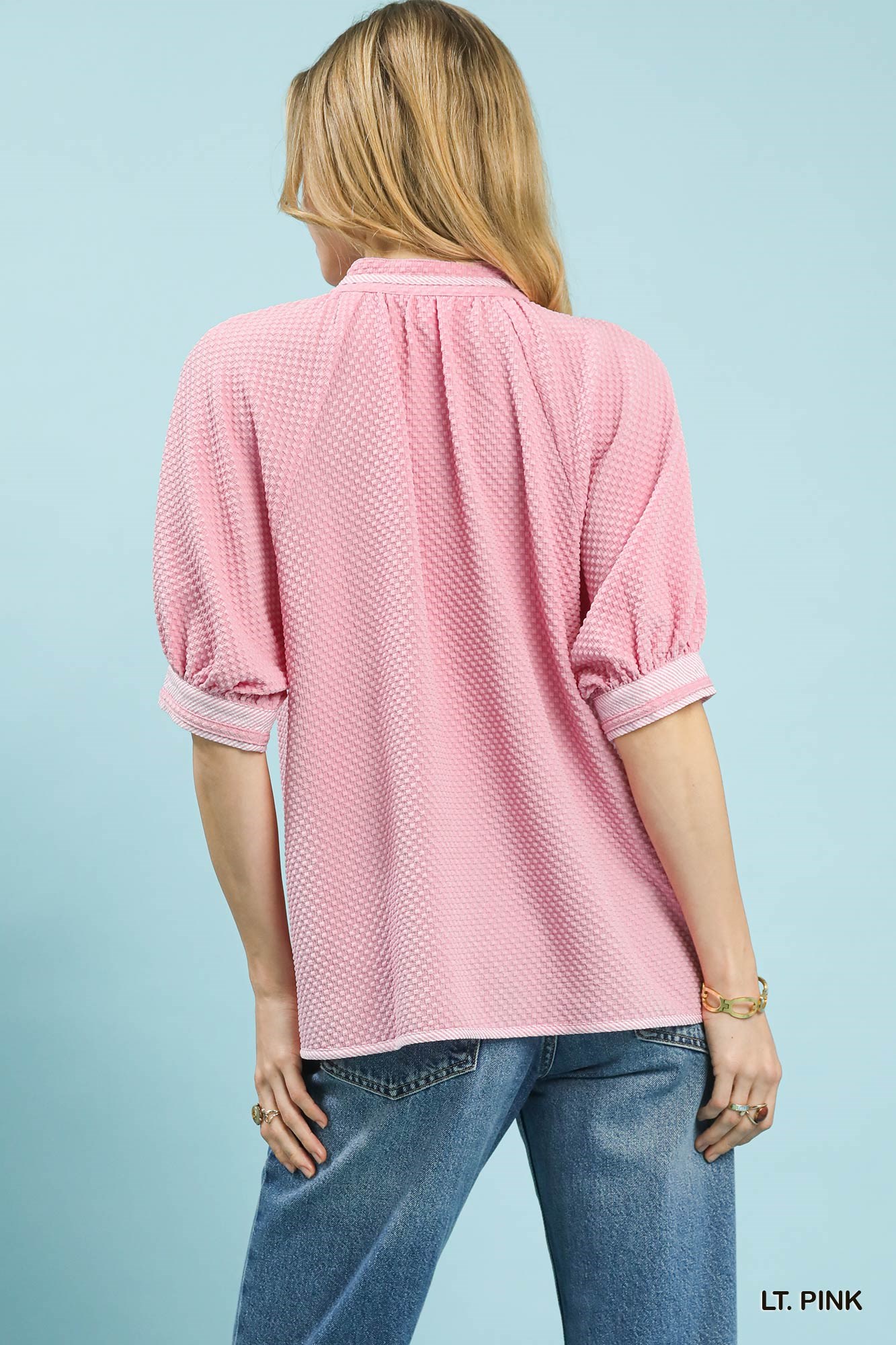 This textured jacquard contrast trim top is made with unique textured jacquard fabric, showcasing a stylish split neckline, cute puff short sleeves, and eye-catching stripe contrast details, while its unlined design ensures lightweight comfort and a chic, easy-to-style look for everyday wear.