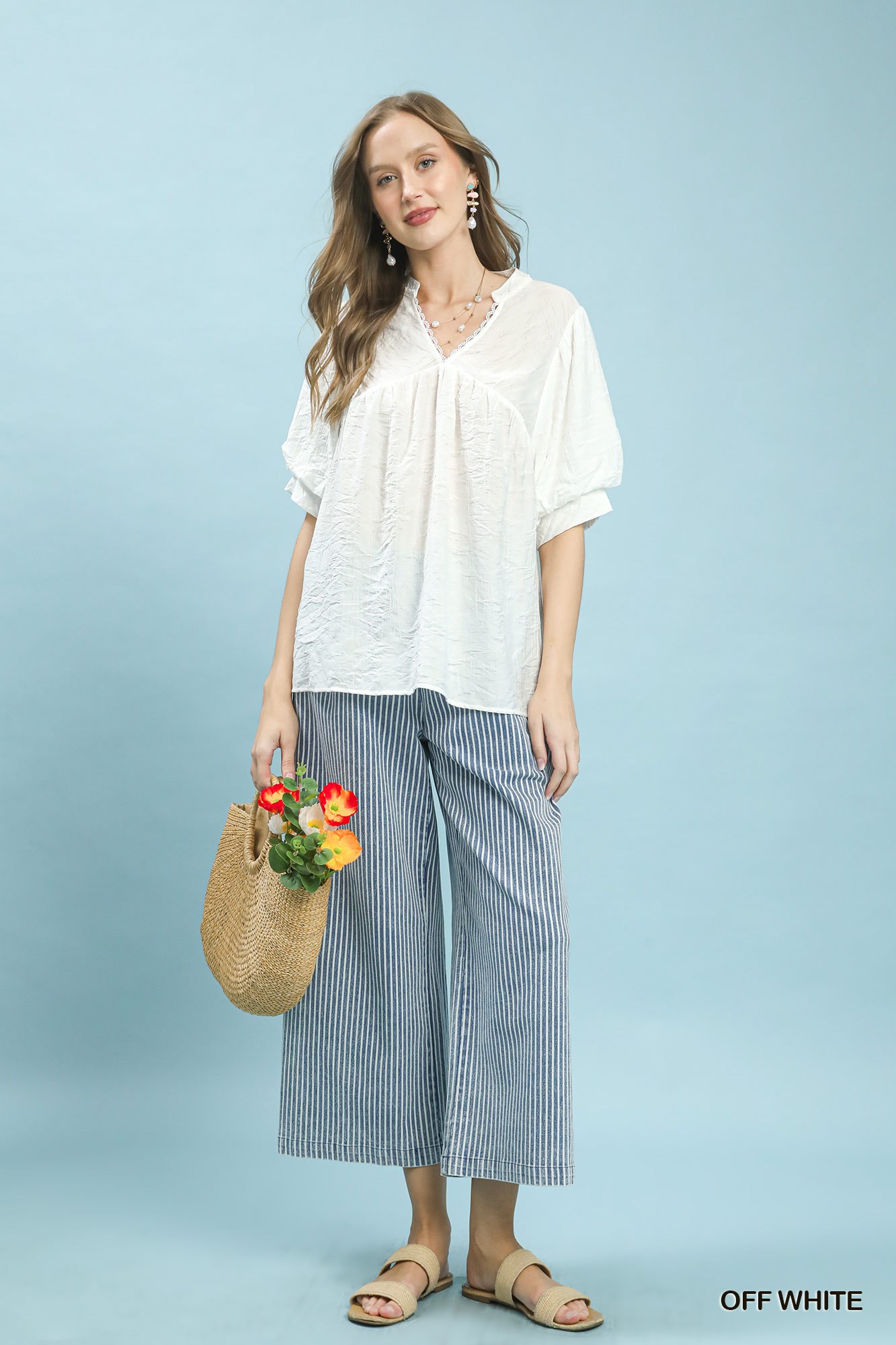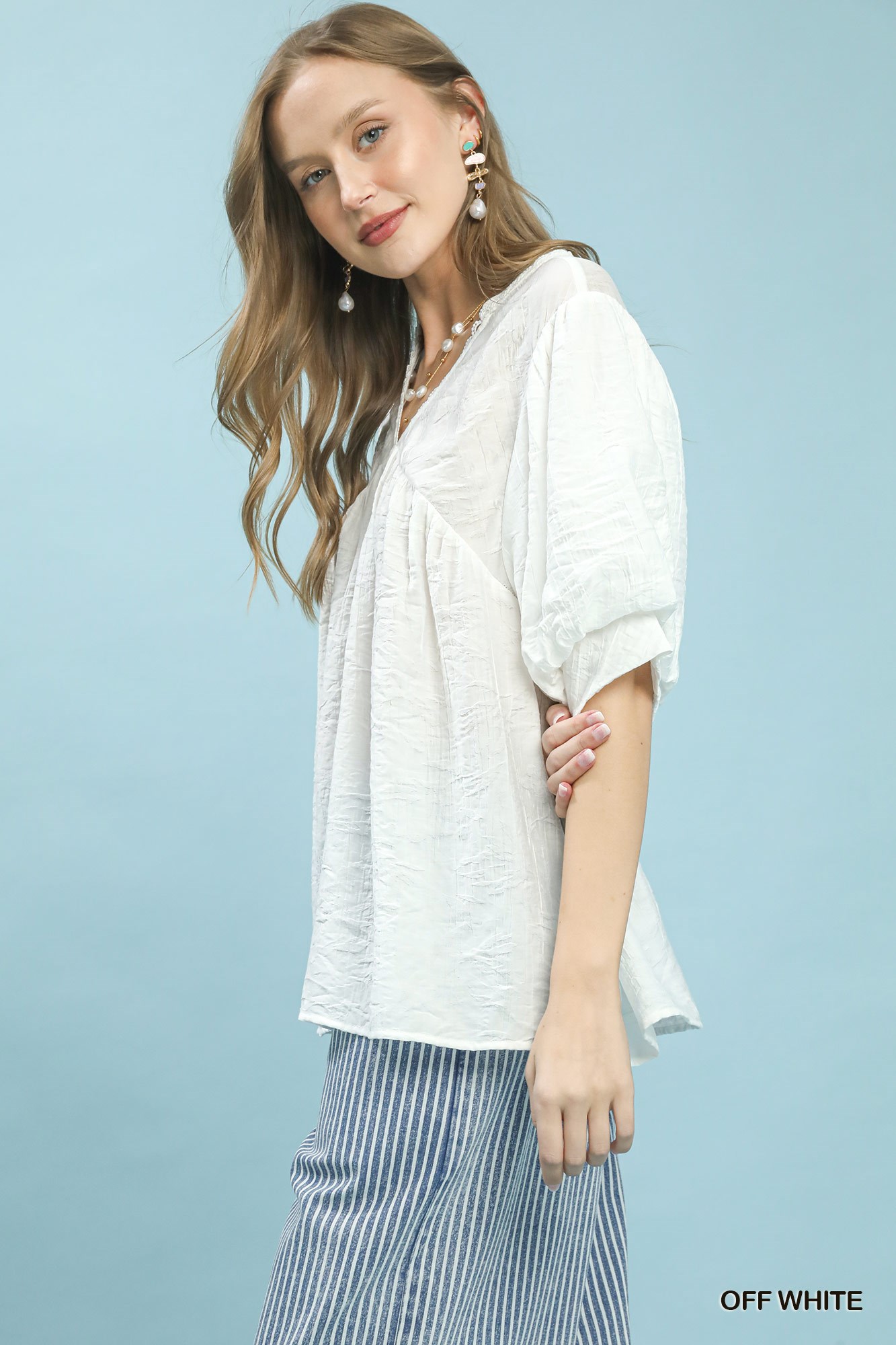 This Textured Lace Trim V-Neck Boho Blouse features a textured crinkle design and V-neck with delicate lace trim. It has short wide flutter sleeves that are lined, perfect for a romantic boho look.