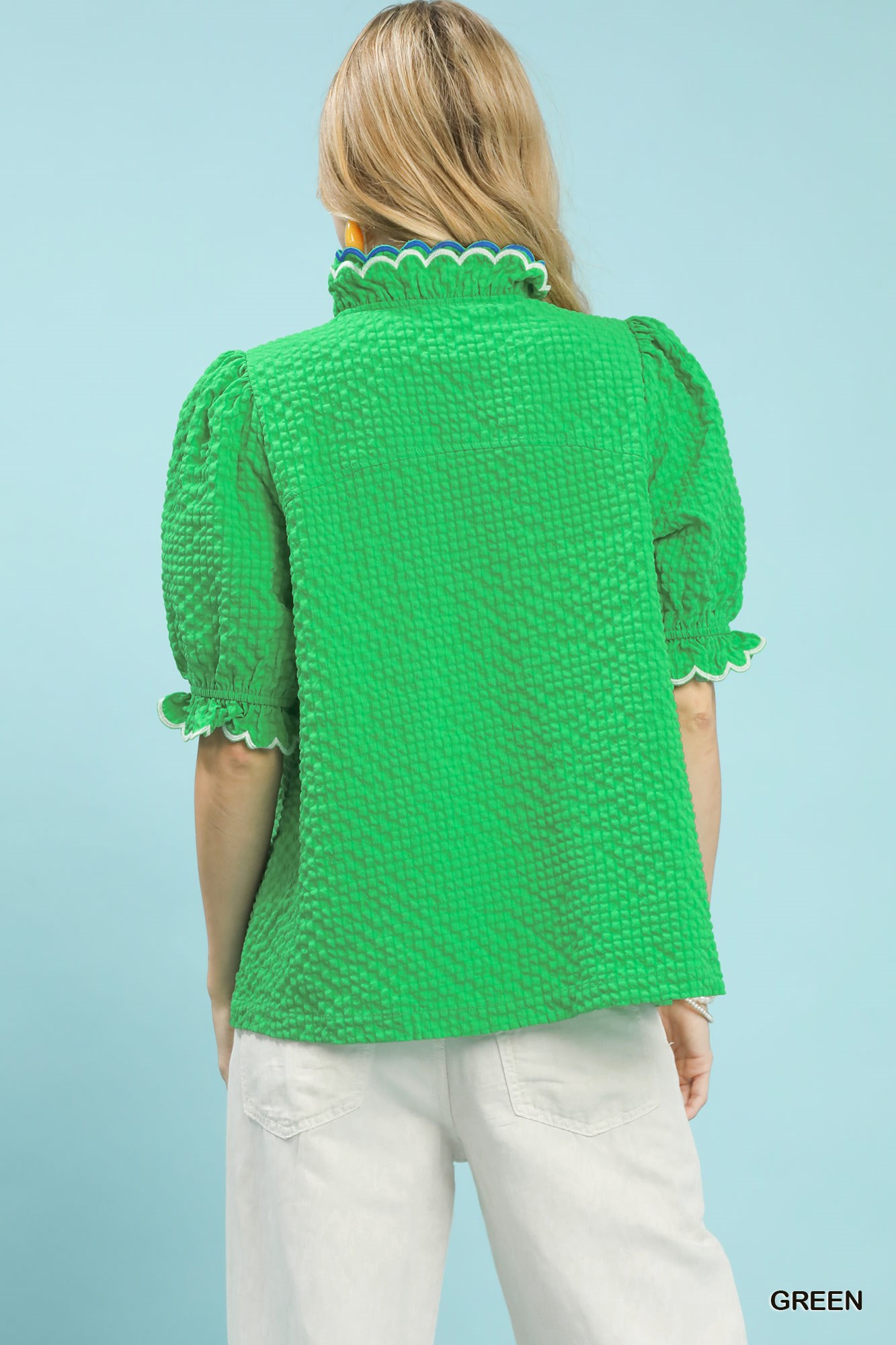 This textured top features scalloped trim neckline with contrast accents for a stylish touch. The puff sleeves with elastic ruffle hem add a feminine and trendy detail to the blouse. Made from a textured fabric, this top is both chic and comfortable to wear. It is not lined, making it breathable for warmer days. Perfect for adding a touch of sophistication to your everyday wardrobe.
