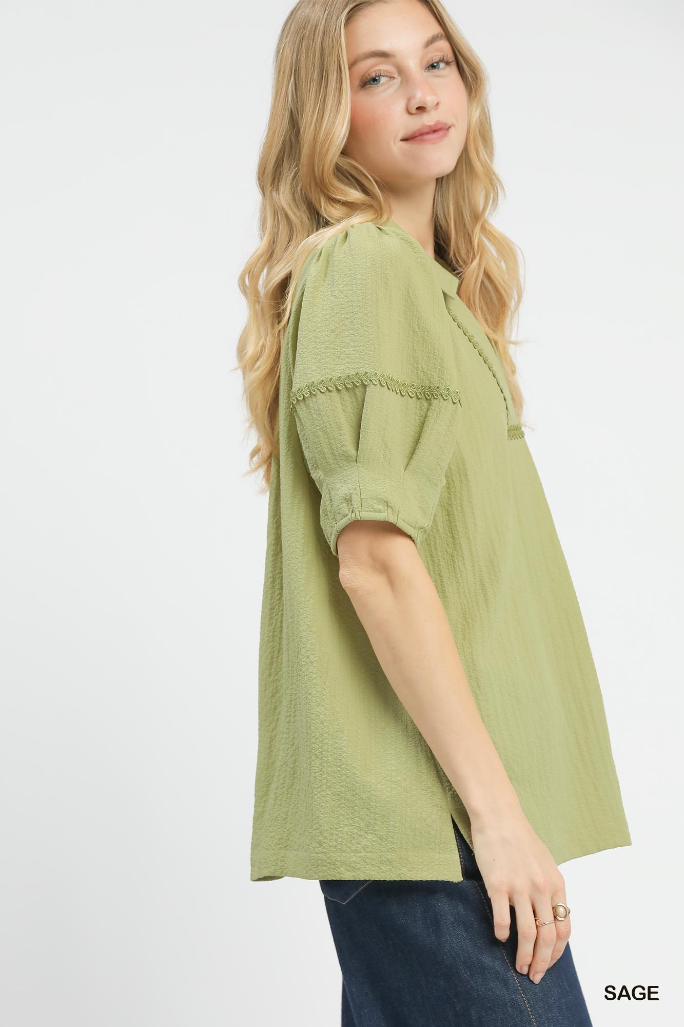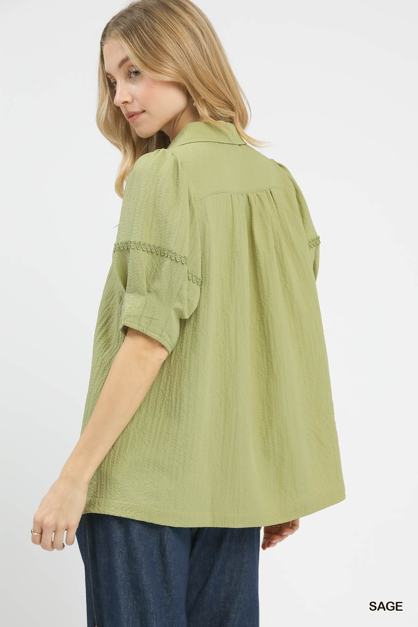 A textured puff sleeve blouse combines stylish texture with on-trend puff sleeves for a fashion-forward and chic look. The textured fabric adds depth and visual interest to the blouse, creating a sophisticated and unique appearance. The puff sleeves add a touch of volume and femininity to the design, making it a versatile piece for various occasions. This blouse can be dressed up with tailored pants or a skirt for a polished outfit, or dressed down with jeans for a more casual look. Overall, a textured puff sleeve blouse is a statement piece that adds flair and personality to any outfit.