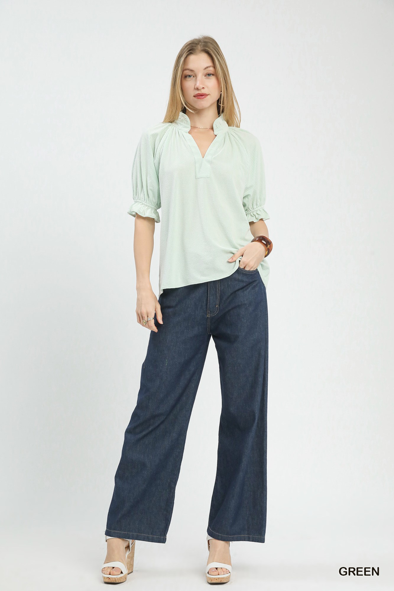 This textured top features a flattering split V-neck design that adds a touch of elegance to your look. The puff ruffle sleeves give a feminine and romantic feel to the garment, perfect for a polished yet relaxed outfit. The texture of the fabric adds depth and interest to the overall aesthetic of the top. While it is not lined, this versatile piece can be easily styled for various occasions, from casual outings to more dressed-up events. Elevate your wardrobe with this textured ruffle sleeve V-neck top that effortlessly combines style and sophistication.