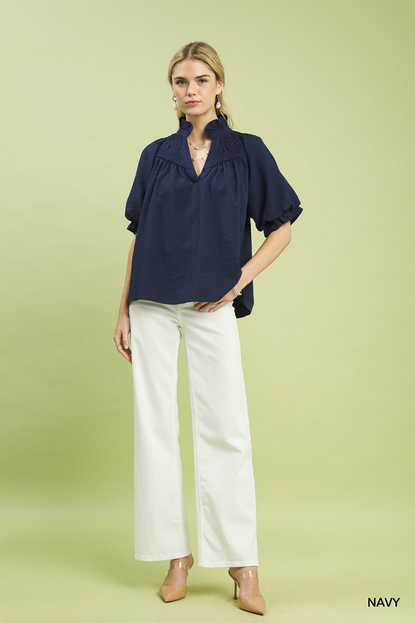 This top features a split V-neck with a soft stand collar for a chic and sophisticated look. The short puff sleeves add a touch of femininity and style. The smocked yoke detailing on the front and back creates texture and visual interest. With a lining for added comfort and coverage, this top is both fashionable and practical. Elevate your wardrobe with this textured smocked yoke split-neck top, a versatile piece that balances elegance with trendy design elements.