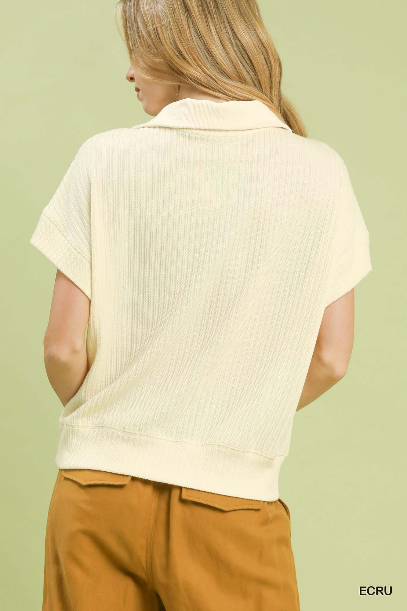 This textured zip collar knit top combines style and comfort with its textured knit fabric and half-zip front design. The contrast striped collar adds a sporty and modern element to the top. Featuring short, cuffed dolman sleeves, this top offers a relaxed yet stylish look. Perfect for casual outings or everyday wear, it is versatile and easy to pair with different bottoms. Please note that this top is not lined, ensuring a lightweight and breathable feel.