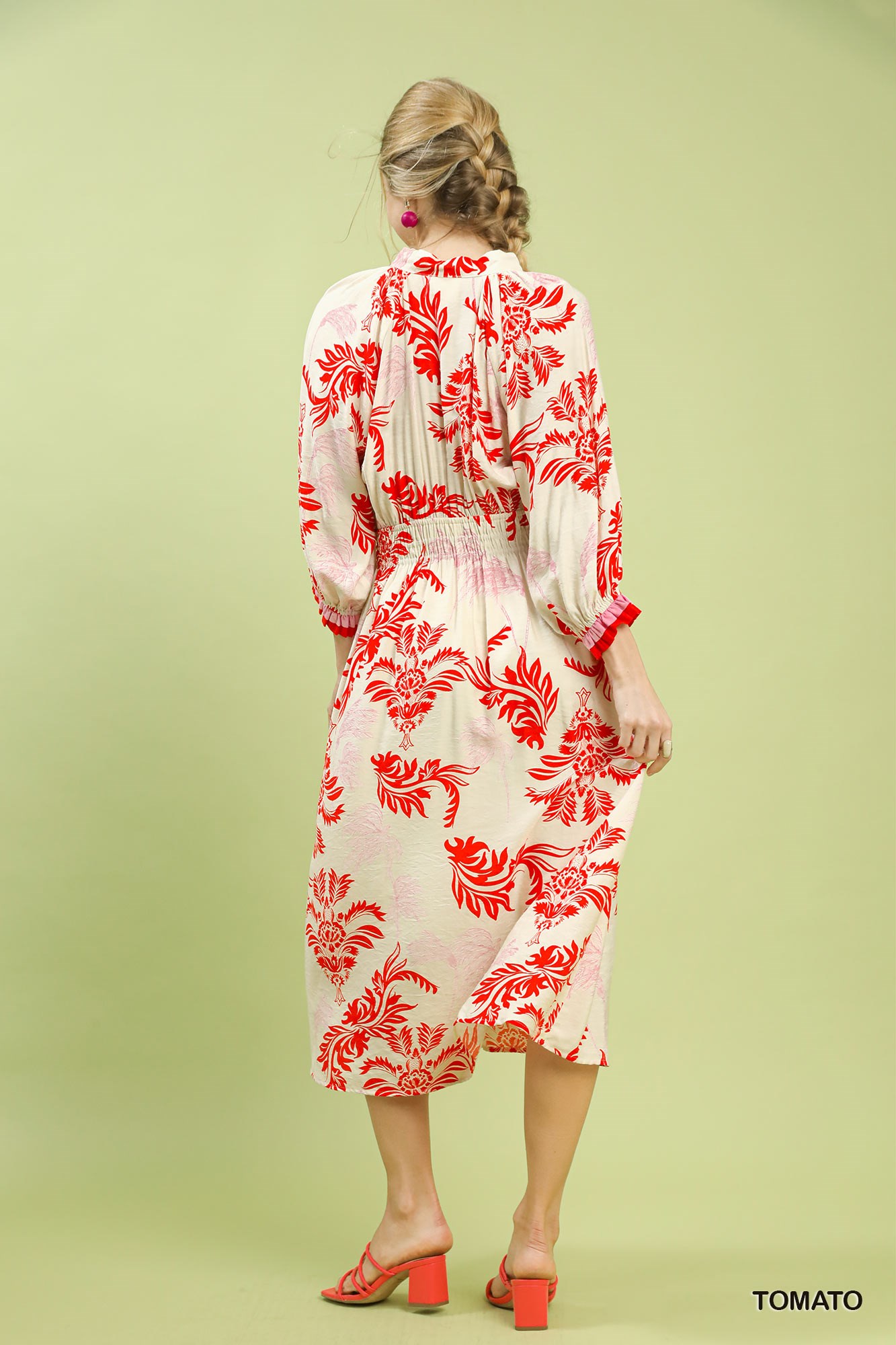 Introducing the Tropical Print Button Detail Midi Dress, a chic and feminine piece perfect for summer days. This dress features key details such as a contrast solid button placket and neckline, as well as ruffle-trim cuffs for added charm. The smocked elastic waistline creates a flattering silhouette, while the midi-length skirt flows beautifully with a tropical print. Lined for comfort and coverage, this dress is both stylish and practical. Elevate your summer wardrobe with this breezy and on-trend Tropical Print Button Detail Midi Dress!
