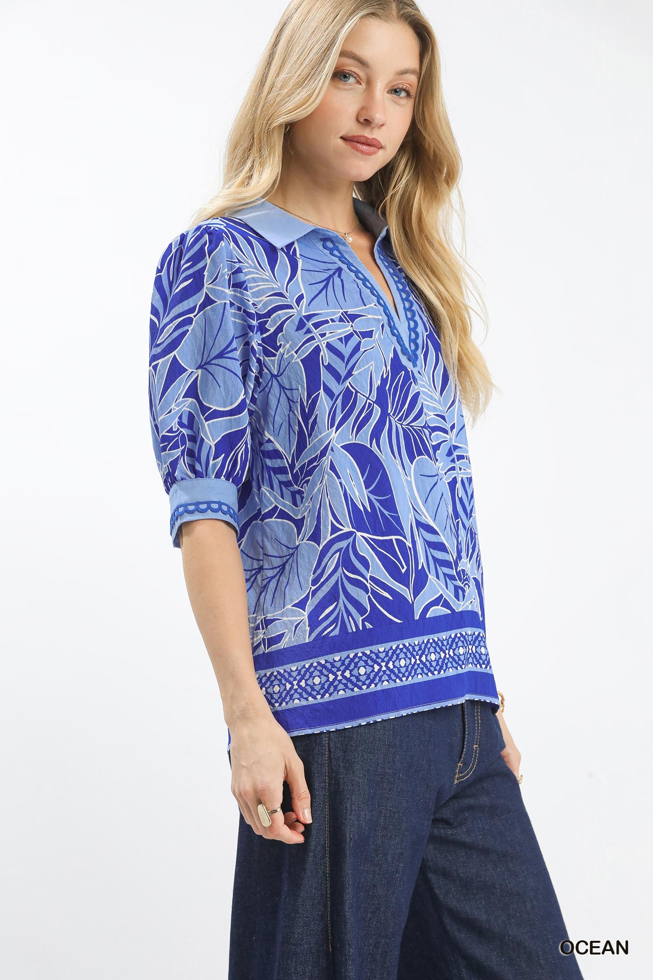 This tropical print puff sleeve blouse is a chic and trendy addition to your wardrobe. The vibrant tropical print brings a playful and summery touch to the blouse. With puff sleeves, this top showcases a stylish and feminine silhouette. The blouse is versatile and can be paired with jeans or skirts for various occasions. Embrace the tropical vibe with this statement piece that is perfect for warm-weather styling.