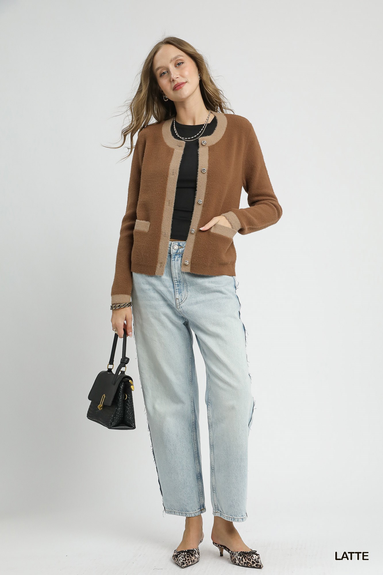 This Two-Tone Button Front Cardigan Sweater is a classic and versatile piece that is perfect for layering. It features a round crew neckline and metallic buttons for a touch of sophistication. The two front patch pockets with contrast trim add both style and functionality to the cardigan. Please note that this cardigan is not lined, making it a lightweight option for various occasions. Elevate your look with this stylish and comfortable cardigan sweater.