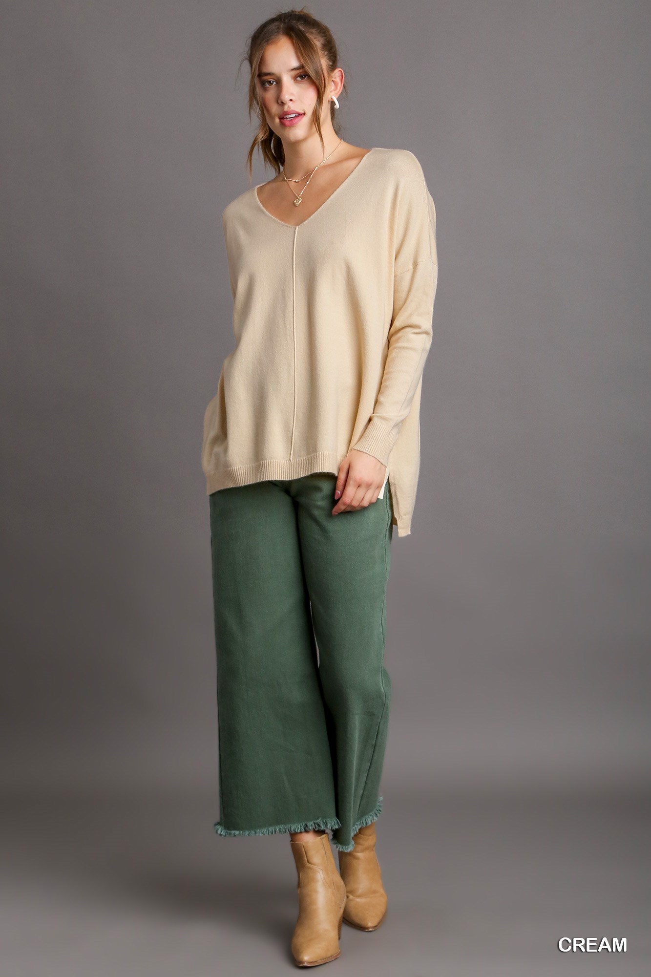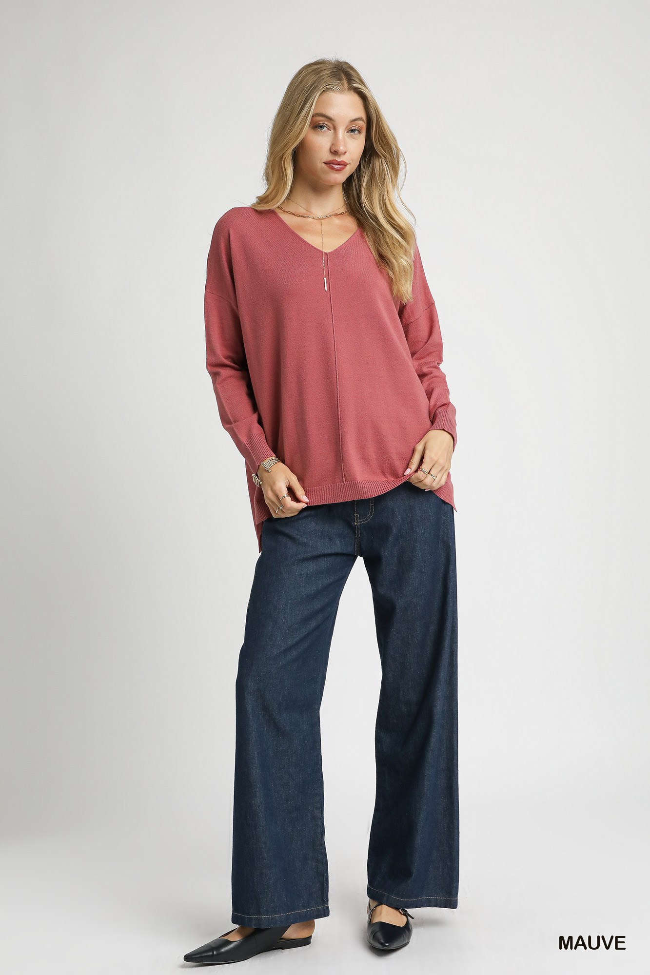 This V-neck knit top features a stylish high-low hem design with side slits for added flair. The V-neckline adds a touch of sophistication and elongates the neckline. The high-low hem creates a modern silhouette that is both flattering and on-trend. With side slits for extra movement and detail, this knit top is perfect for casual or dressed-up occasions. Elevate your wardrobe with this versatile and chic piece.