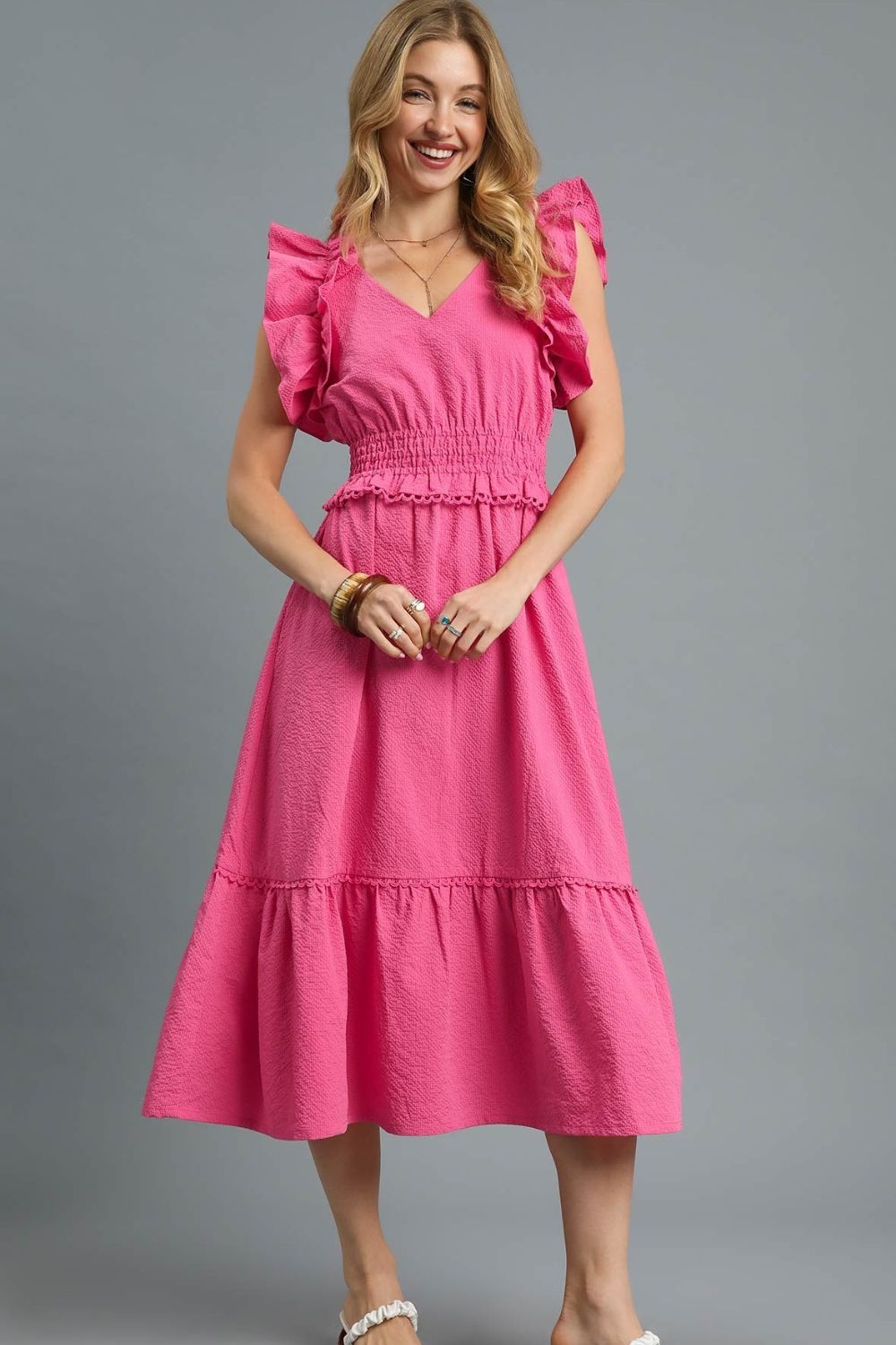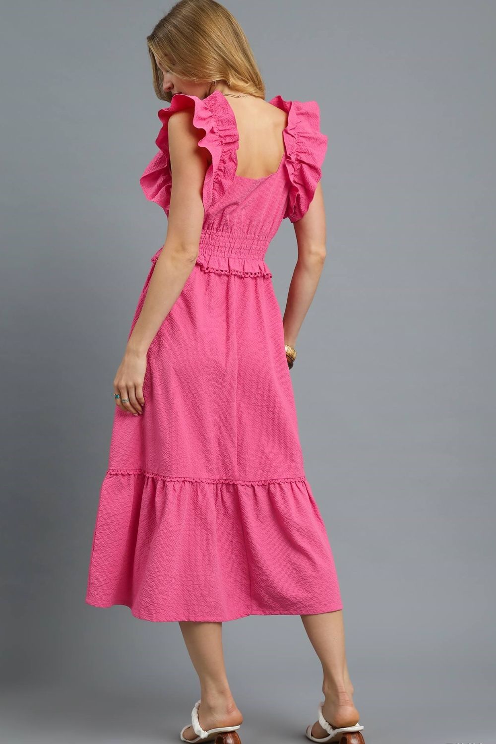 This stunning pink midi dress features eye-catching ruffle shoulder straps and a flattering smocked waist that accentuates your silhouette. Made from lightweight, breathable fabric perfect for warm weather styling. The romantic ruffle details and tiered hem create a feminine, flowy appearance while the elastic waistband ensures comfortable all-day wear. The vibrant pink hue makes it perfect for spring and summer occasions, from brunch dates to garden parties. The midi length offers modest coverage while maintaining a fashion, contemporary look.