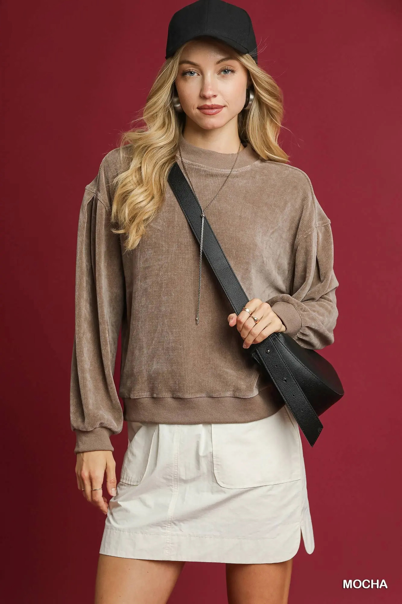 The velour crewneck balloon sleeve sweatshirt is a luxurious and trendy option for a cozy and chic look. The velour fabric offers a soft and velvety feel, adding a touch of elegance to the classic crewneck sweatshirt style. The balloon sleeves provide a fashion-forward twist, creating a voluminous and statement silhouette. This sweatshirt is perfect for a stylish and comfortable outfit, ideal for both lounging at home or running errands in style. Pair it with jeans or leggings for a relaxed yet fashion-forward ensemble that combines comfort with sophistication.