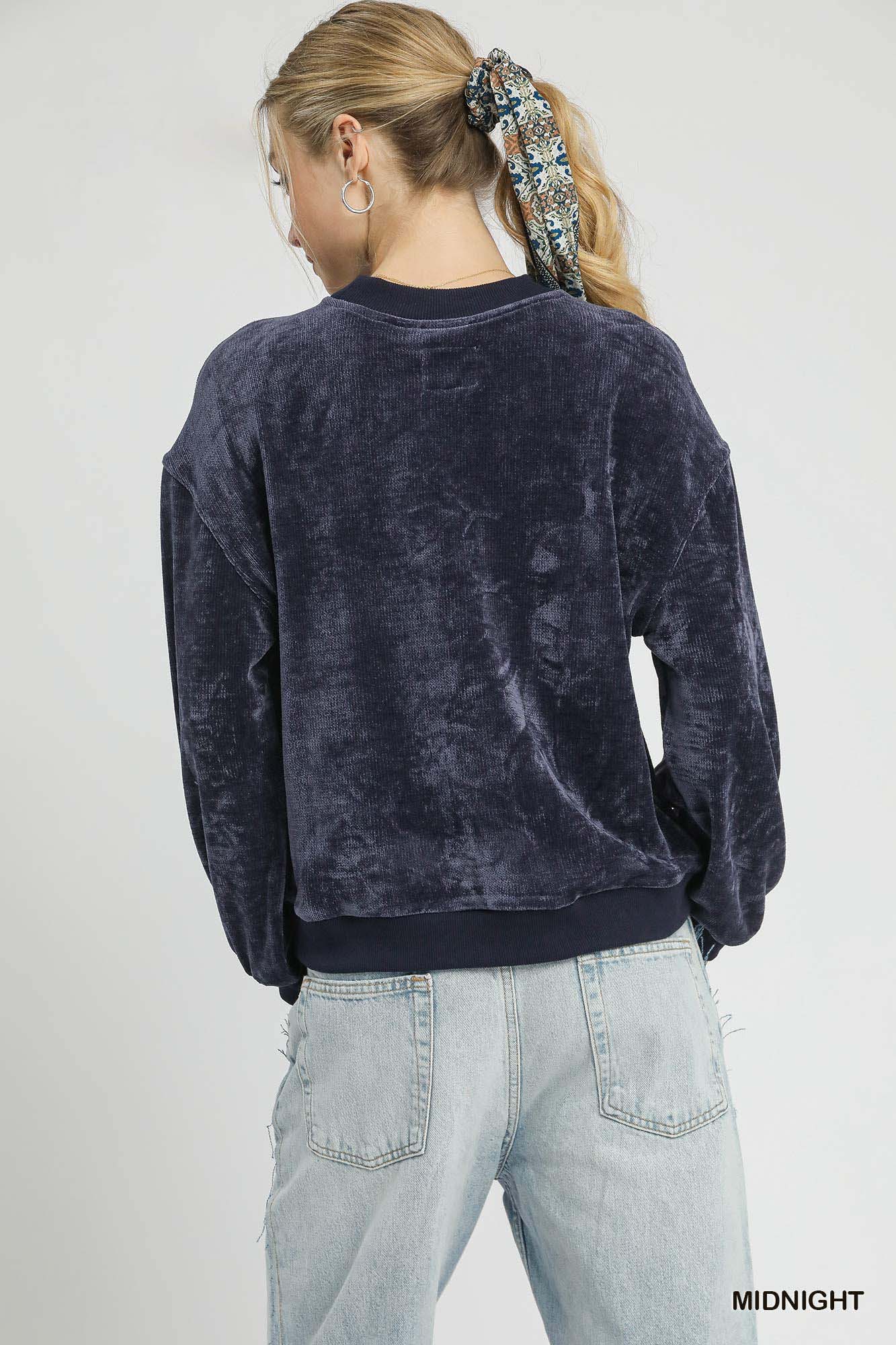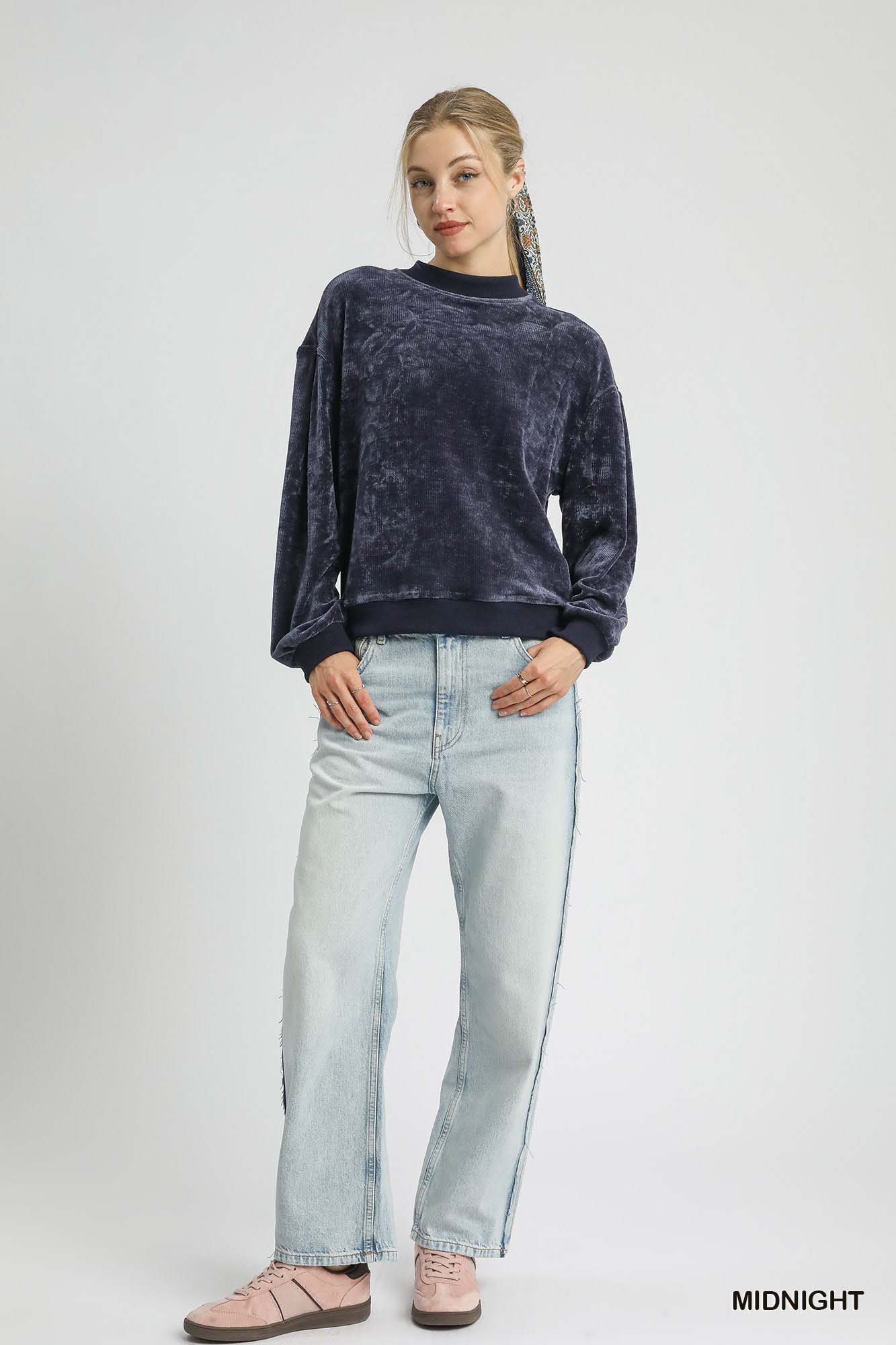 The velour crewneck balloon sleeve sweatshirt is a luxurious and trendy option for a cozy and chic look. The velour fabric offers a soft and velvety feel, adding a touch of elegance to the classic crewneck sweatshirt style. The balloon sleeves provide a fashion-forward twist, creating a voluminous and statement silhouette. This sweatshirt is perfect for a stylish and comfortable outfit, ideal for both lounging at home or running errands in style. Pair it with jeans or leggings for a relaxed yet fashion-forward ensemble that combines comfort with sophistication.