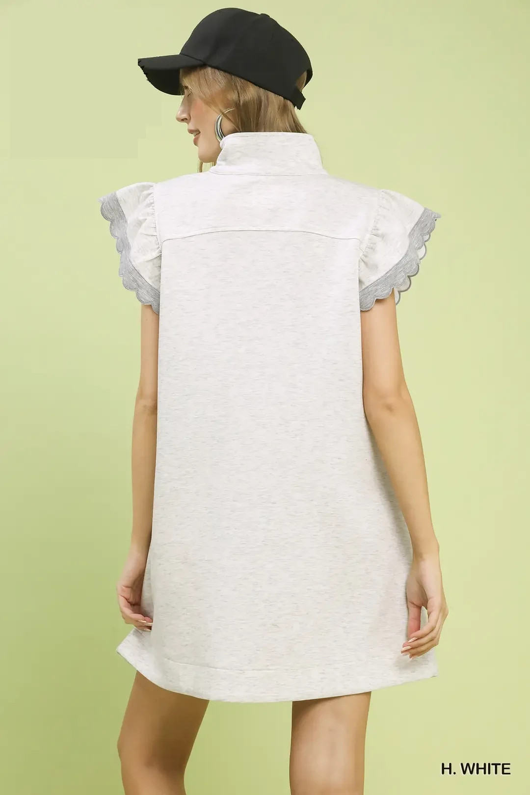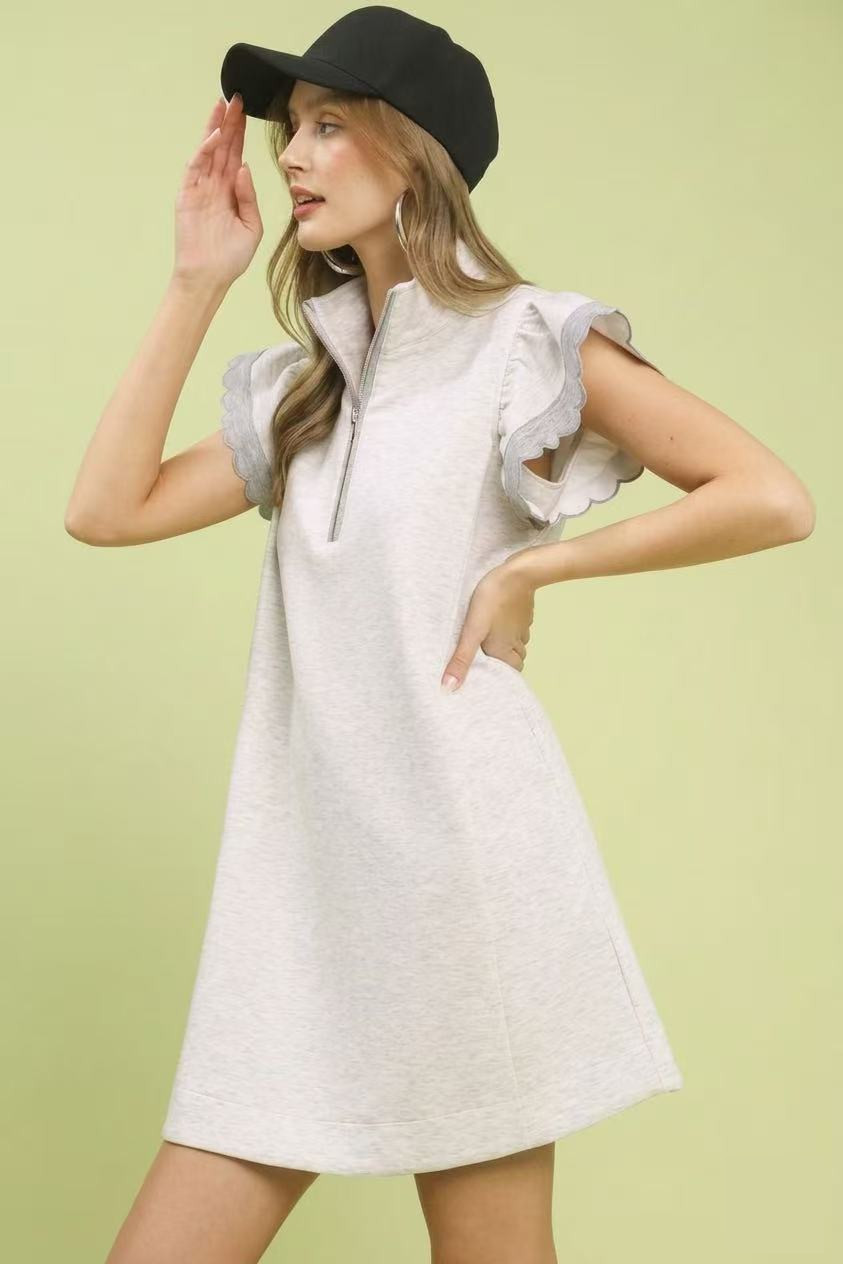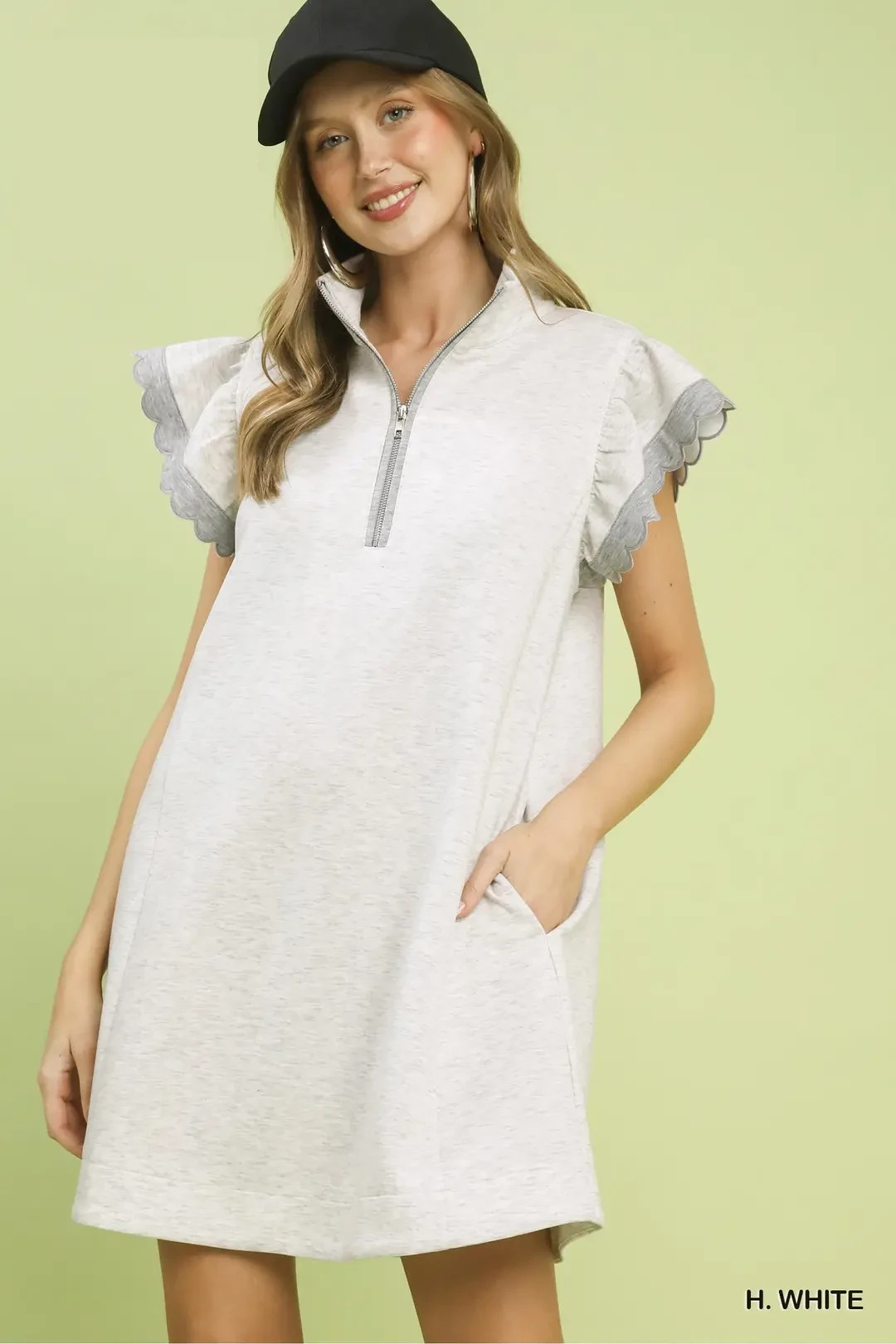 This dress features a sleek half-zip mock neck for a modern touch, paired with delicate short flutter sleeves trimmed with scalloped contrast detailing for a feminine finish. Designed with convenient side pockets and an unlined construction for lightweight breathability, it combines casual comfort with stylish accents, making it perfect for daily outings, weekend brunches and warm-weather occasions.