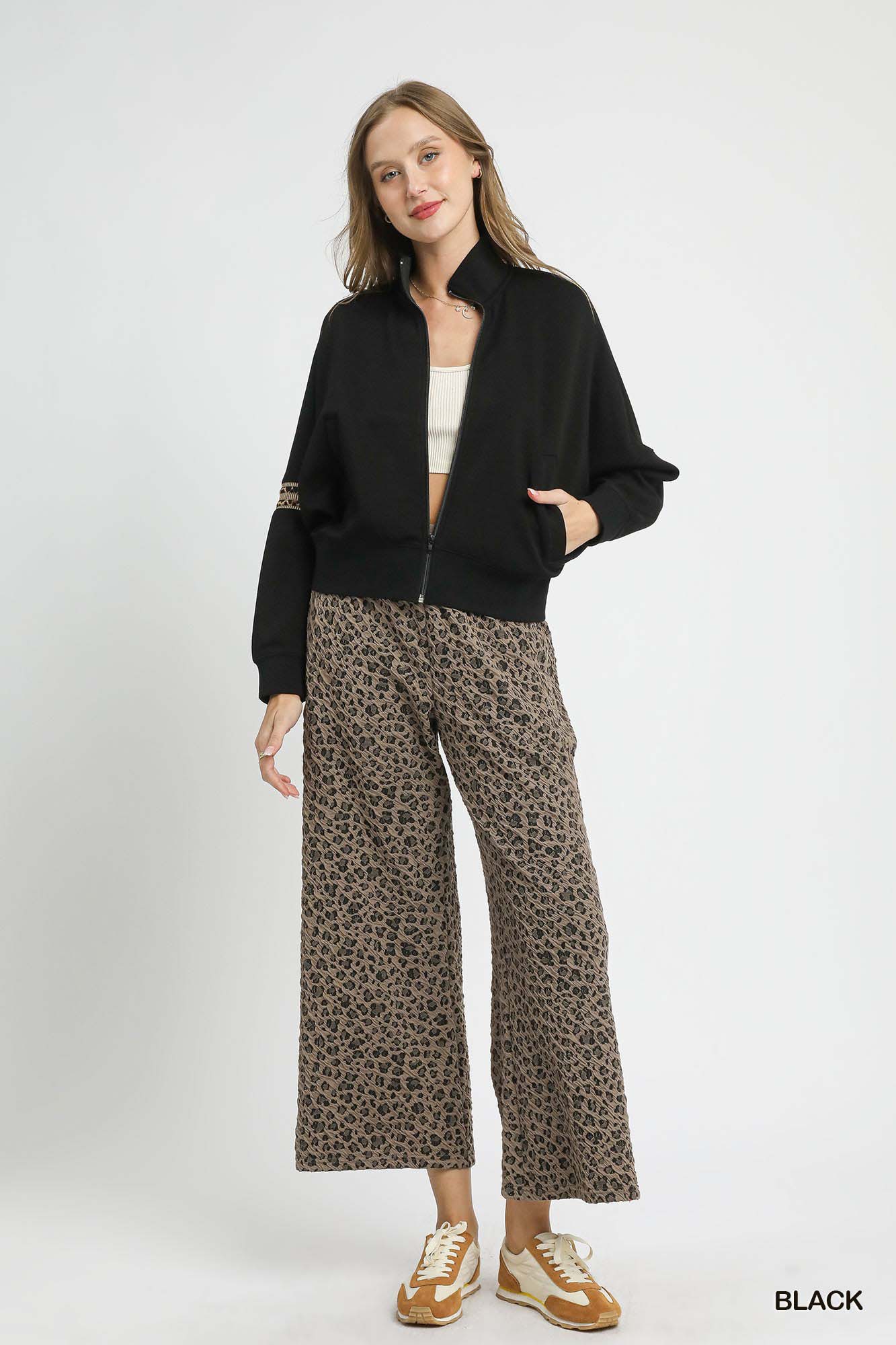 This stylish cropped jacket is made of luxurious knit fabric and features a ribbed collar, cuffs, and hem for a comfortable fit. The long sleeves are adorned with eye-catching leopard print trim detail, adding a touch of wild flair to the design. With side pockets for added convenience, this jacket offers both style and practicality. It is not lined, making it ideal for layering over your favorite tops for a fashionable ensemble. Stay cozy and chic in this trendy zip-up jacket with a bold leopard print twist.