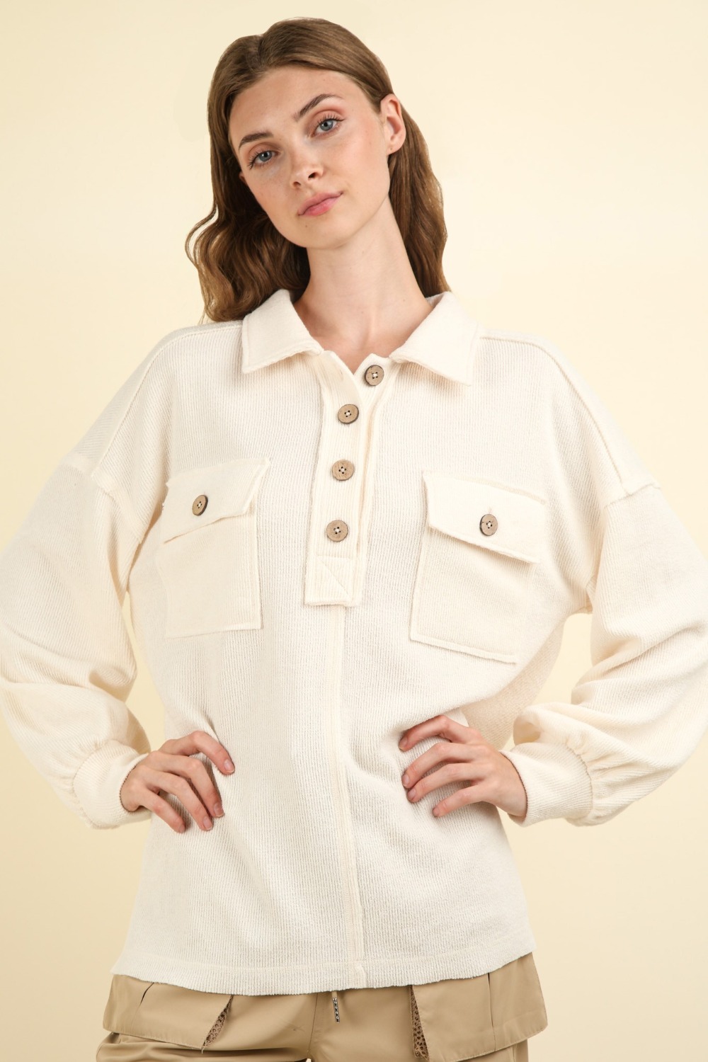 The Collared Half Button Knit Top with Pockets offers a stylish, oversized fit that exudes casual comfort. Its drop shoulder and long sleeves enhance the relaxed vibe, while the front chest pockets add a practical touch. The shirt knit design combines classic shirt structure with the softness of knit fabric. Side slits and a hi-lo hem provide a contemporary, flattering silhouette. Perfect for layering or wearing on its own, this top is a versatile addition to any wardrobe.