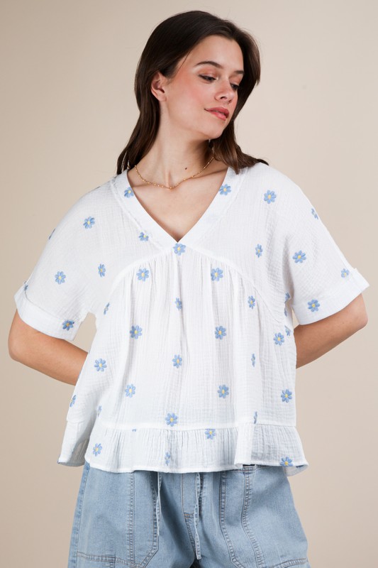 The Flower Embroidered Woven Blouse is a delicate and feminine piece that adds a touch of charm to your wardrobe. The flower embroidery detailing on the blouse gives it a romantic and elegant feel. Made from woven fabric, it offers a structured and polished look. The blouse is versatile and can be easily dressed up or down for different occasions. Pair it with jeans for a casual day out or with trousers for a more sophisticated ensemble. This blouse is perfect for adding a soft and pretty touch to your outfit!