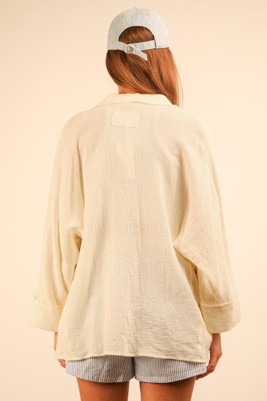 A dolman sleeve button down gauze shirt features a relaxed fit with stylish dolman sleeves. The button-down design adds a classic touch to the gauzy fabric. This shirt is versatile and can be dressed up or down for various occasions.